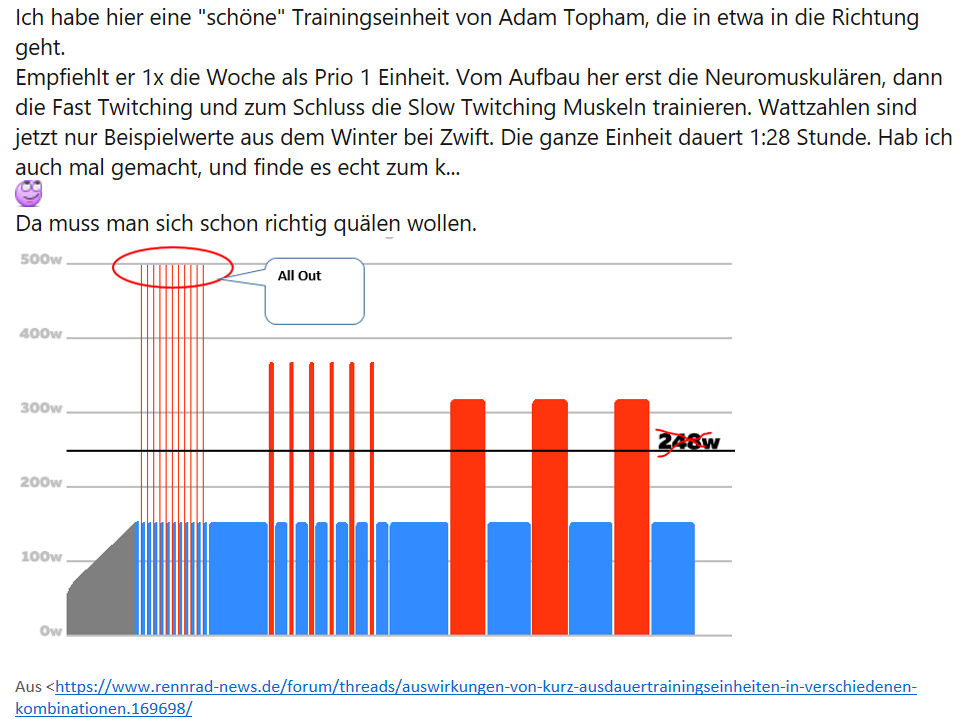 Manchmal fühle ich mich wiederum so frisch, dass da gleich 330 zu Anfang steht, dann mach ich halt einfach nen spontanen 20'-FTP-Test daraus. Scheiß auf das 5'-all-out-Priming, ganz stressfrei, ohne sich da tagelang drauf vorzubereiten. Wie soll ich sagen, dadurch, dass ich die 300 im Hinterkopf "immer sicher hab", auch im Winter, geht man die Intervalle halt ganz stressfrei an. Fühle ich mich mal nicht gut, sag ich mir, ach.. 290 reichen.. und am Ende macht man dann doch 300 davon. Es ist halt irgendwie etwas anderes, als wenn ich verzweifelt und leicht gestresst immer HIT-Sachen mache, 30"/30"er, 4x4, und noch ne neue Sau.. und am Ende nicht so richtig weiß, was am Ende dabei rumkommt, ob das eine nicht doch besser war als das andere... Ich glaube es ist schwierig, im zunehmenden Alter vielleicht noch mehr, wirklich dauerhaft seinen Körper mit HIT zu Bestleistungen zu treiben.