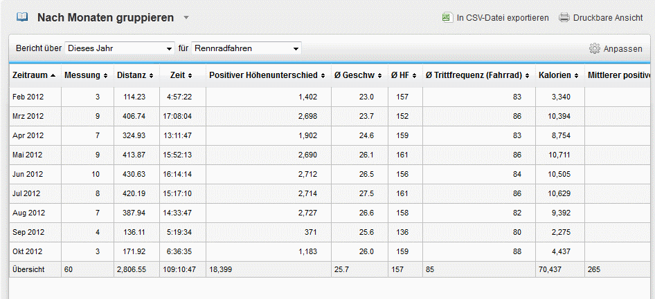Da bin ich mal wieder. Mit dem Rennrad habe ich bis jetzt 2800km geschafft und insgesamt mit MTB usw. 3200 km. Bis zum Juni hin habe ich mich gut verbessern können, schaut mal ins Bild (nur RR). Leider bin ich dann wieder langsamer geworden. Im September und Oktober musste ich mal arbeiten und war im Urlaub usw, deswegen bin ich da etwas eingebrochen, die niedrige HF im September lag dran, dass mich meine Freundin auf dem zweiten RR begleitet hat.