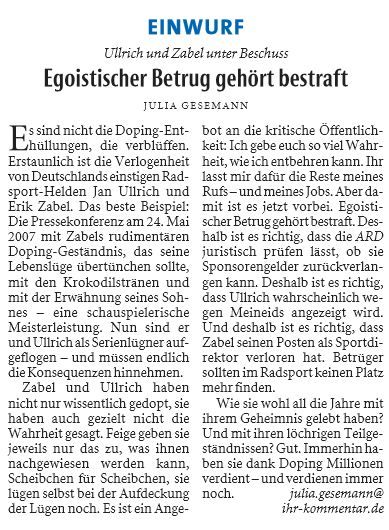 beide Artikel zeigen mal wieder Glanz und Elend der Sportberichterstattung. Nein, eher nur Elend. Bei Sätzen wie "Egoistischer Betrug gehört bestraft" soll einem Schreiber sofort die Tastatur unter den Fingern zerbröseln. "Betrüger sollten im Radsport keinen Platz mehr finden" Wie einfach kann jemand gestrickt sein, der sowas schreibt? Sponsoren, die ihre Gelder zurückfordern, wollen mit Sicherheit auch den Gewinn zurückgeben (an wen eigentlich?), den sie durch den Betrug erzielt haben. Oder etwa die Sponsorengelder zurück haben wollen, die Kohle, die sie damit verdient haben, aber für sich behalten? Der Drops ist gelutscht.