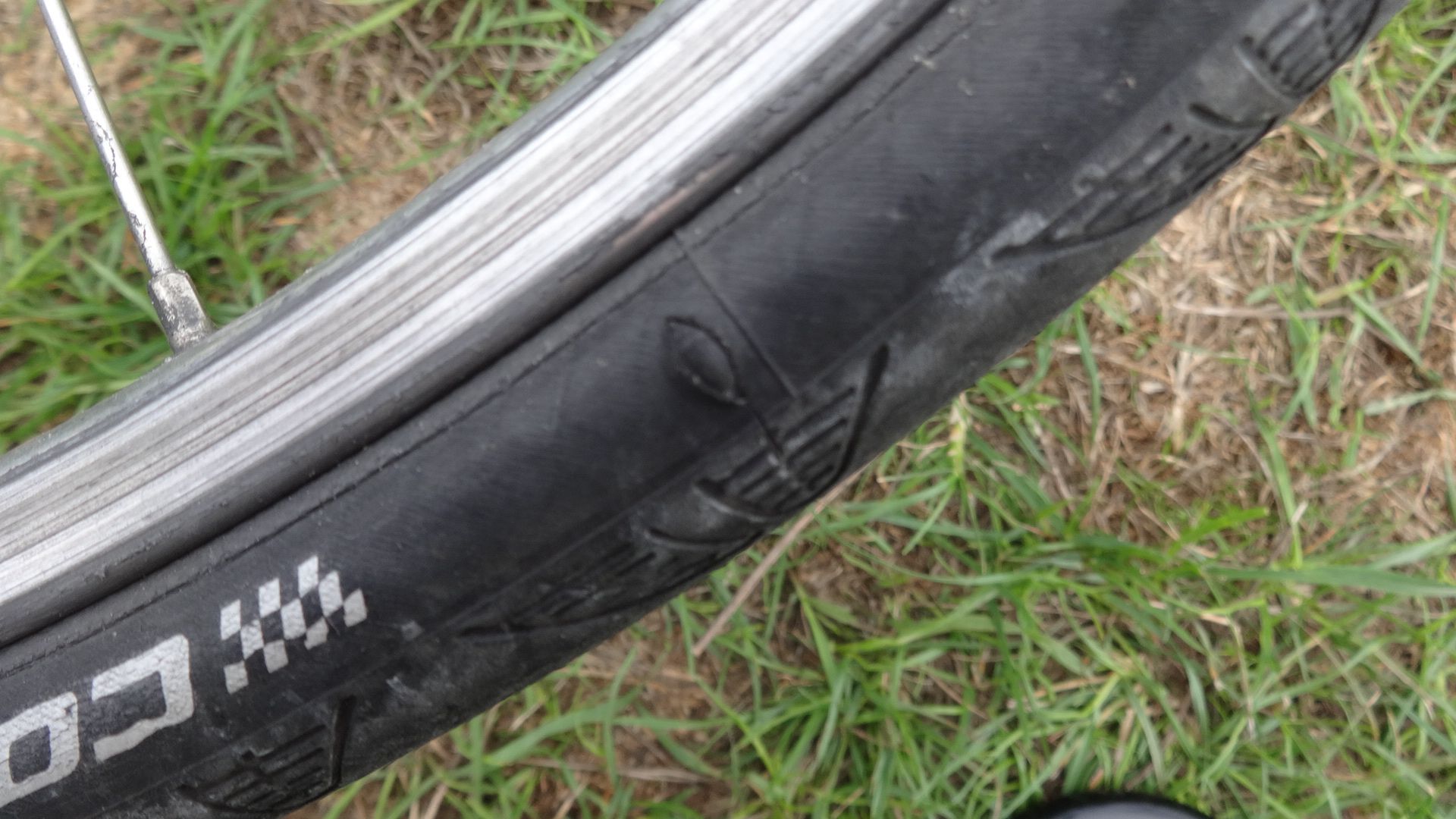 Samstags dann der Schreck. Ein bisher nicht aufgefallener Schnitt an meinem Vorderrad, aus dem bereits der