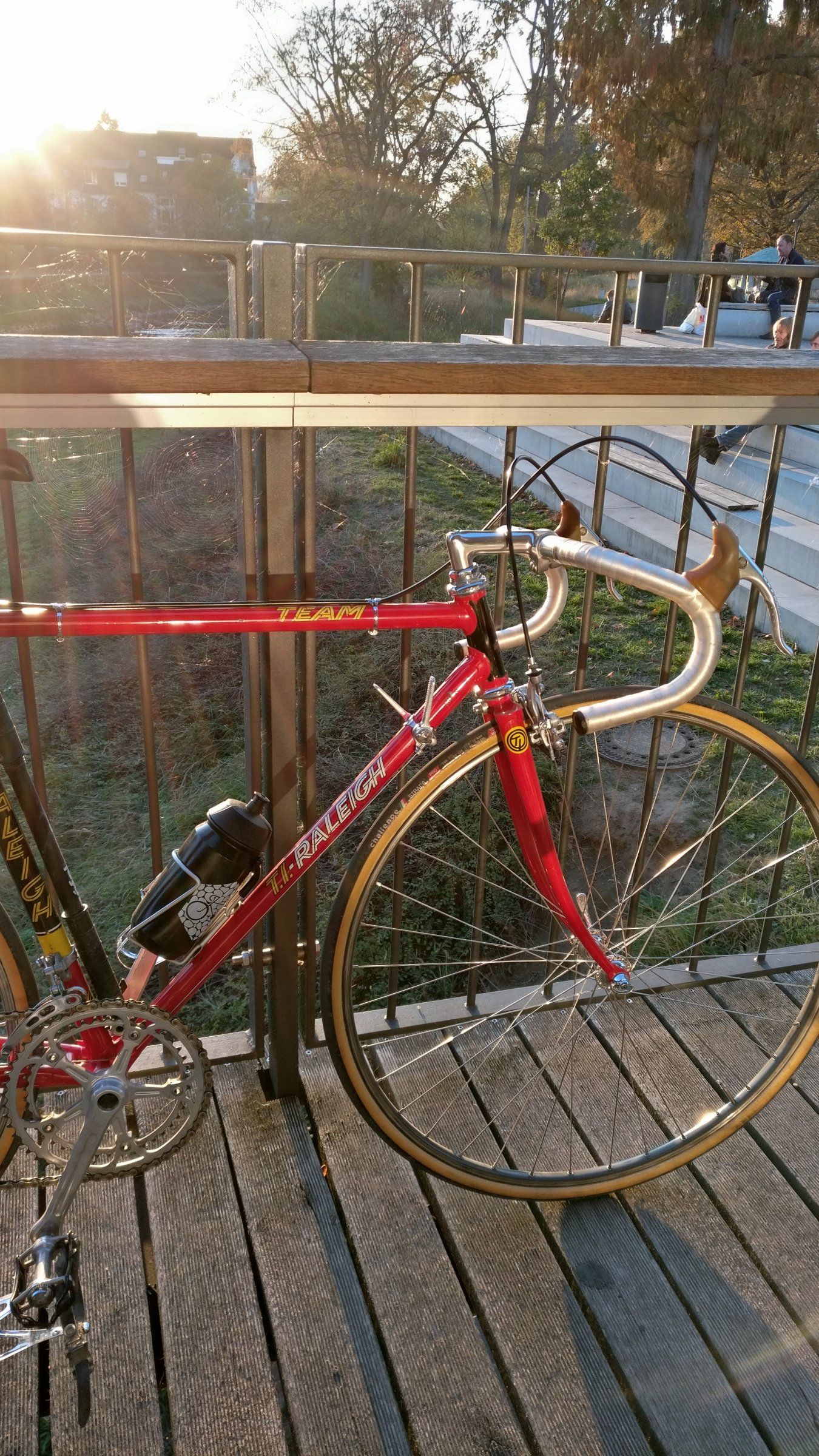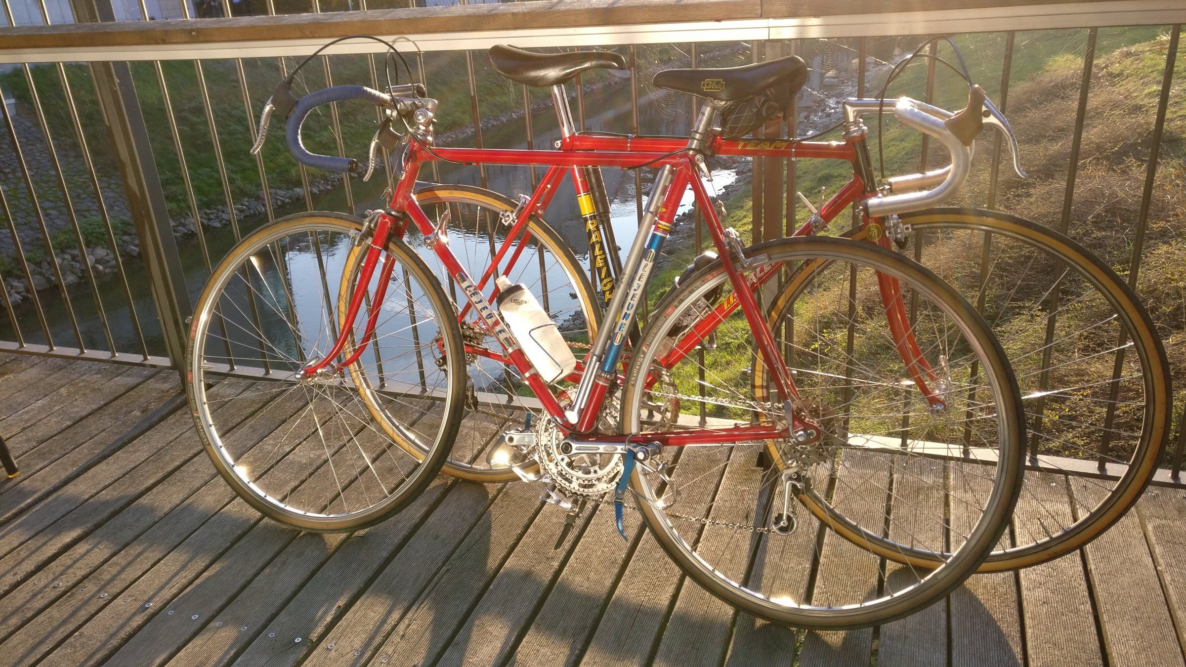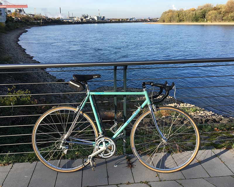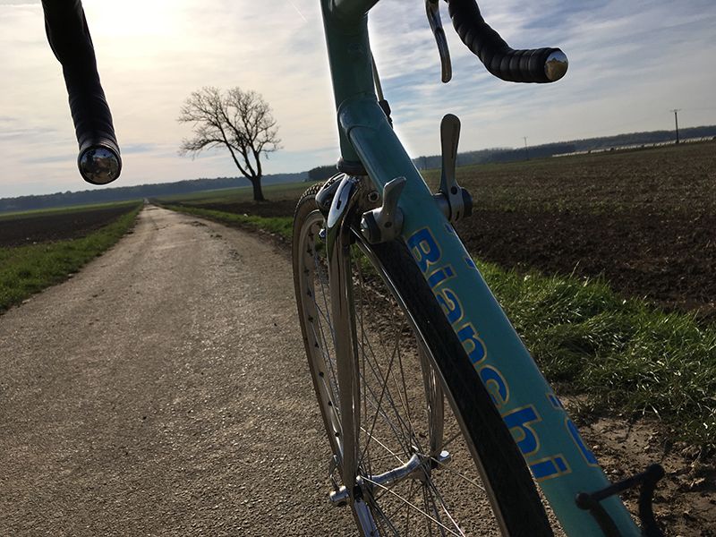 Das Rad hatte ursprünglich einen hellen Sattel (mit Bianchi Schriftzug) und Lenkerband in Rahmenfarbe.