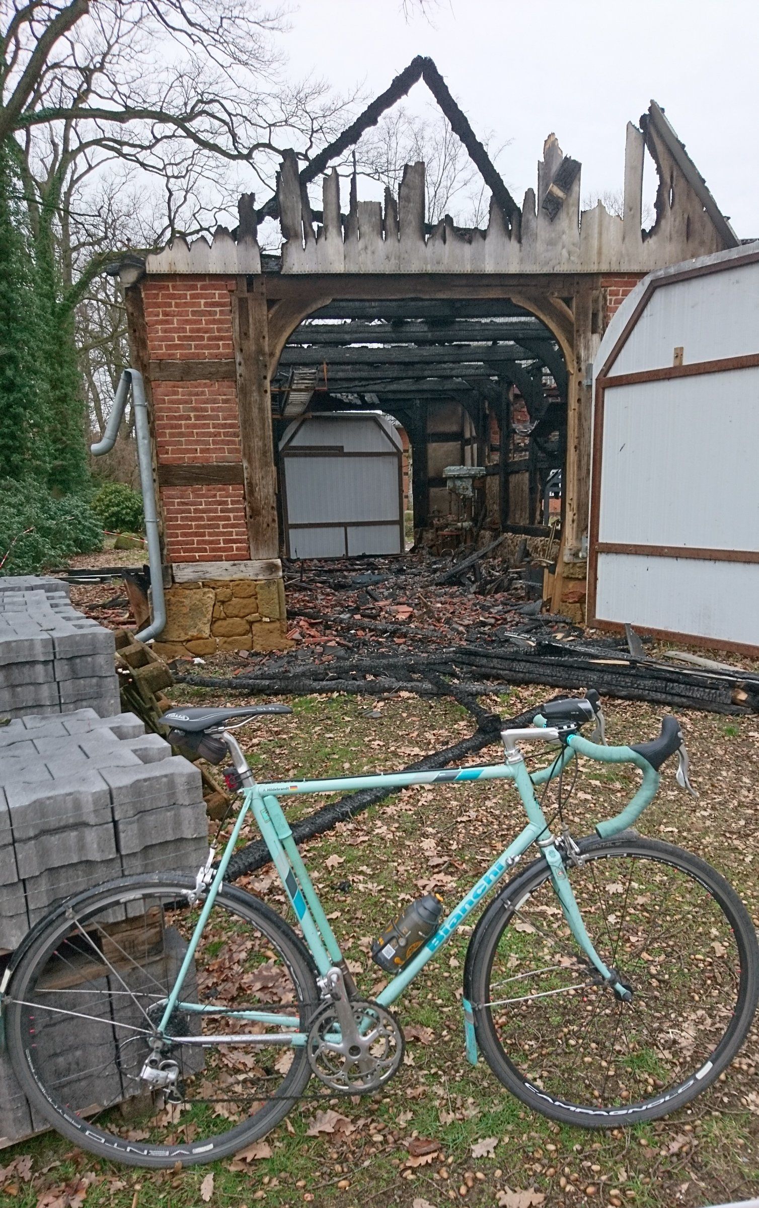 Das ist das himmelblau von Bitterfeld vor der WendeNatursteinsockel und so spricht jedenfalls für deutlich vor 1910er Baujahr. Das ist sehr schade um den Schuppen, trotz der unpassenden Blechtore. Die haben es natürlich überstanden... Glaube kaum, dass er wiederaufgebaut wird. Die Balkenlage könnte sogar faktisch noch standfest sein, weil nach Bild nur äußerlich verkohlt, aber Ingenieursvorsicht wird da keine Risiko eingehen wollen und Baufirmenbosse schwafeln sowieso gerne von "das machen Sie aber auch noch neu?!"