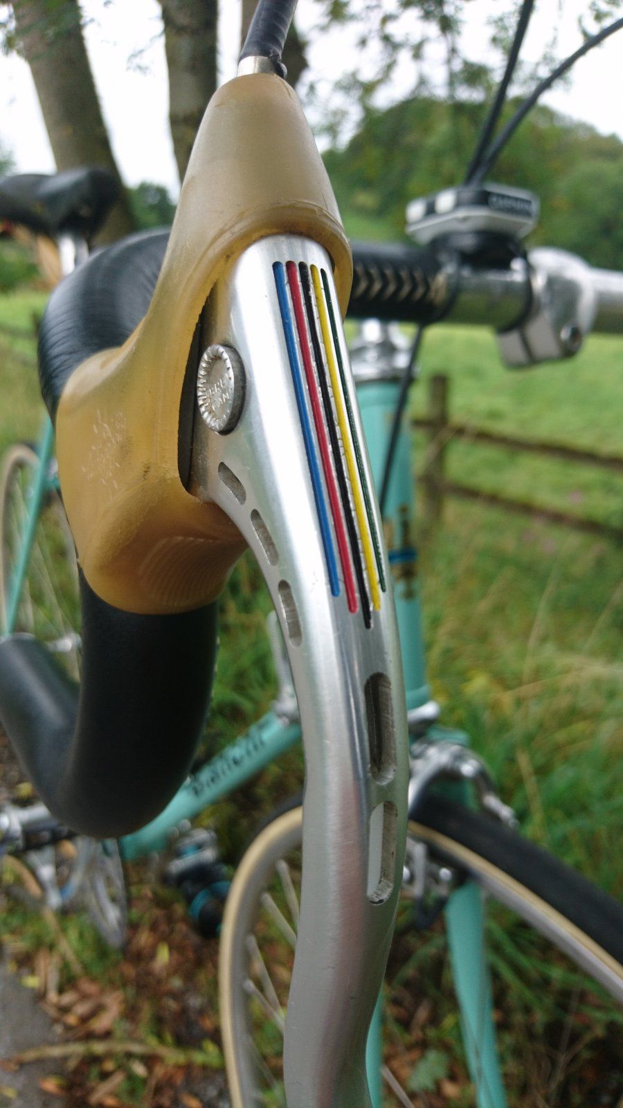 Heute gabs den zweiten Teil des Tests für das Bianchi-Treffen in zwei Wochen. Das Specialissima Barcellona durfte ran. Auch hier, Luft aufpumpen und gut. Die alte Regina Oro rasselt unaufhörlich, lediglich bei perfektem Kettengeradeauslauf, also großes Blatt und hinten das dritte Ritzel oder kleines Blatt und hinten das vierte, dann ist Ruhe. Aber so kann man mich immer gut hören. Wie haben das die Leute früher ausgehalten? Dieses Gerassel bringt einen ja um den Verstand. Aber schön sieht sie aus...