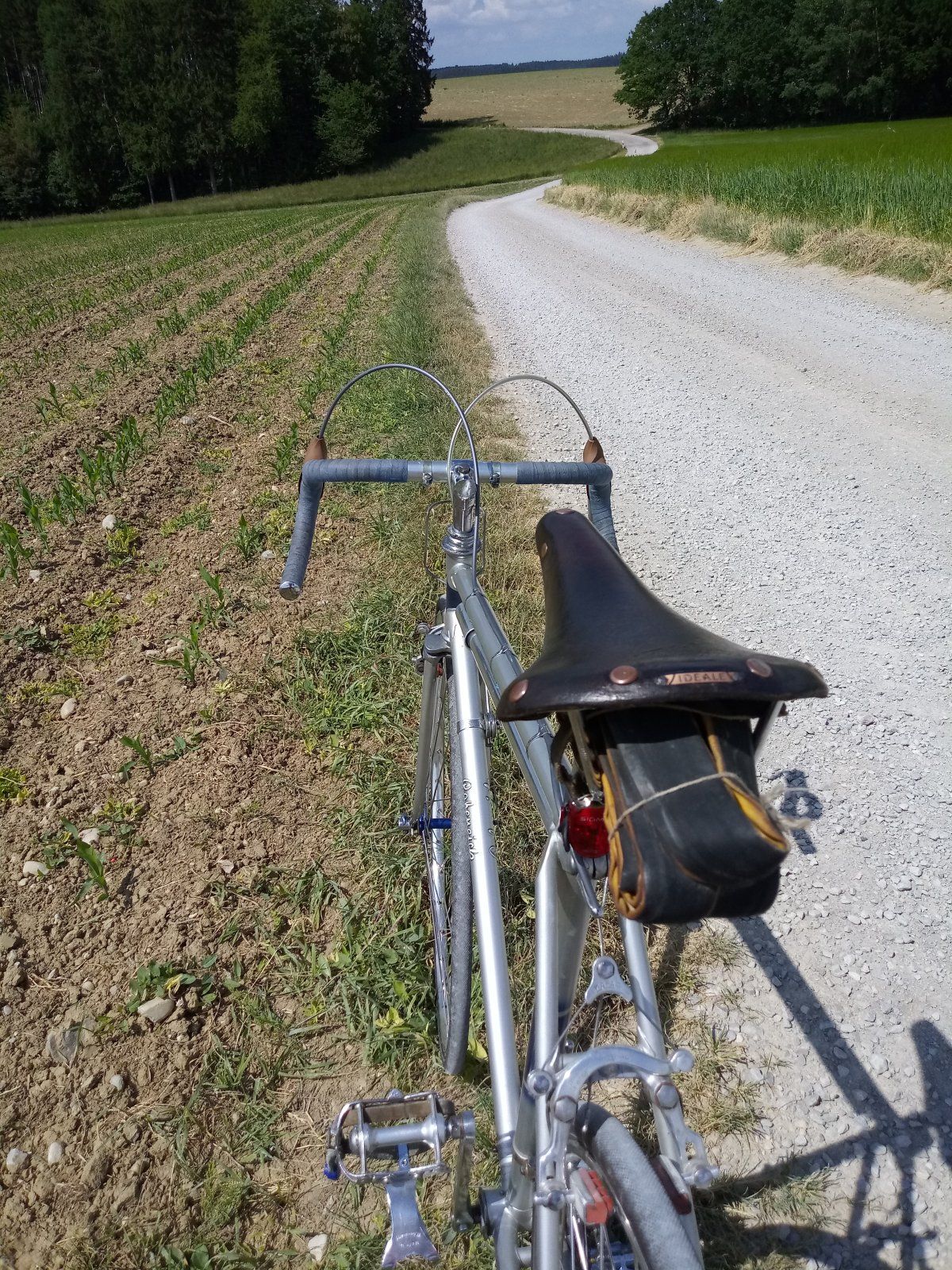 Das Rad ist ja wirklich piccobello, sogar der Schlauchreifen ist korrekt gefaltet.Auf gesplitteten Naturstrassen, einem gängigen Habitat alter Rennmaschinen . . . .