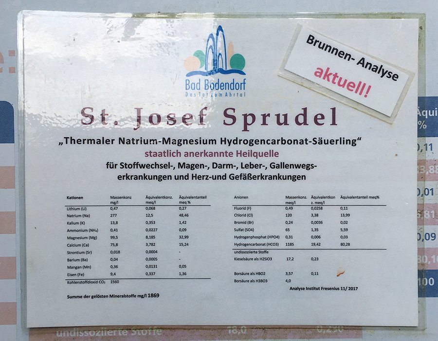Einzig die öffentlich zugängliche St. Josef Sprudel Quelle ist einigermassen wiederhergestellt. Hab mir ein bisschen abgefüllt und mit dem Duralex Picardieglas probiert. Ich kann den Geschmack nicht richtig beschreiben – irgendwie „Eisenhaltig“, nicht penetrant. Anwendung 3 mal am Tag, vor den Mahlzeiten, wird empfohlen.