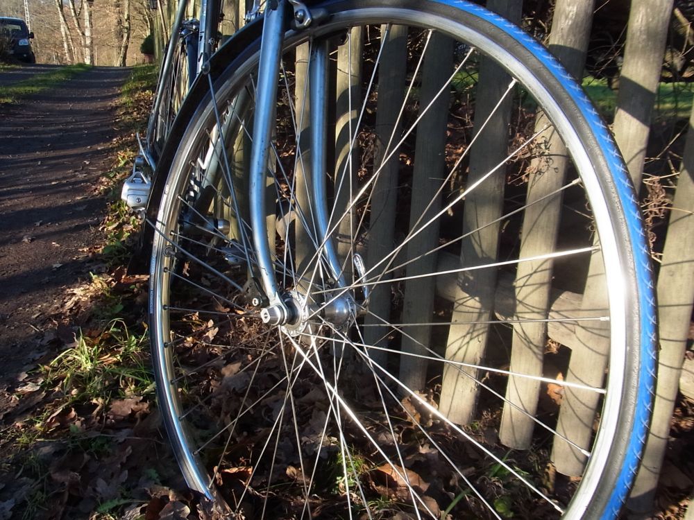 Heute also bei vollster Sonnenkraft und schwacher Brise unterwegs. Snel bitte! Die 105er Naben von herrn Pfeuffer sind restauriert, das Ambrosio Aluminium glänzt. Es muß nicht immer Mavic sein. Passend konnte ich auch die schönen blauen Hutchinsons (schwere Traktorreifen, gerade recht für Westerwälder höhenwege) einrollen, die ich dem unwissenden Montabici verdanke.