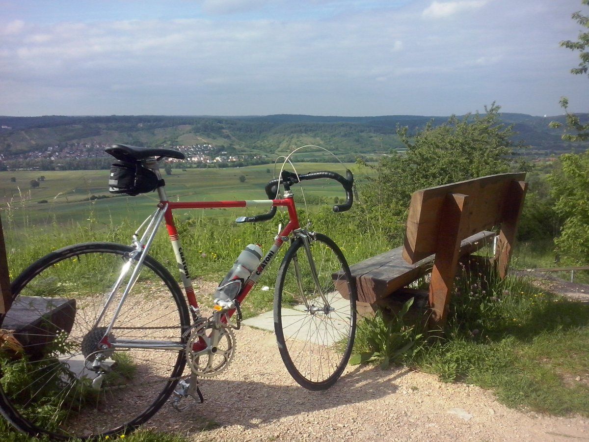 Mein Trainingszustand lässt zu wünschen übrig, aber immerhin pack ich es mit meiner Heldenkurbel (42/28) jetzt auf 10%-Steigungen "mühelos." Hier die Aussicht am Ende einer solchen. Die Alb ruftDas Wetter war wunderschön, da nicht zu warm und nicht zu kalt, und zudem wolkig, was am schönsten ist.