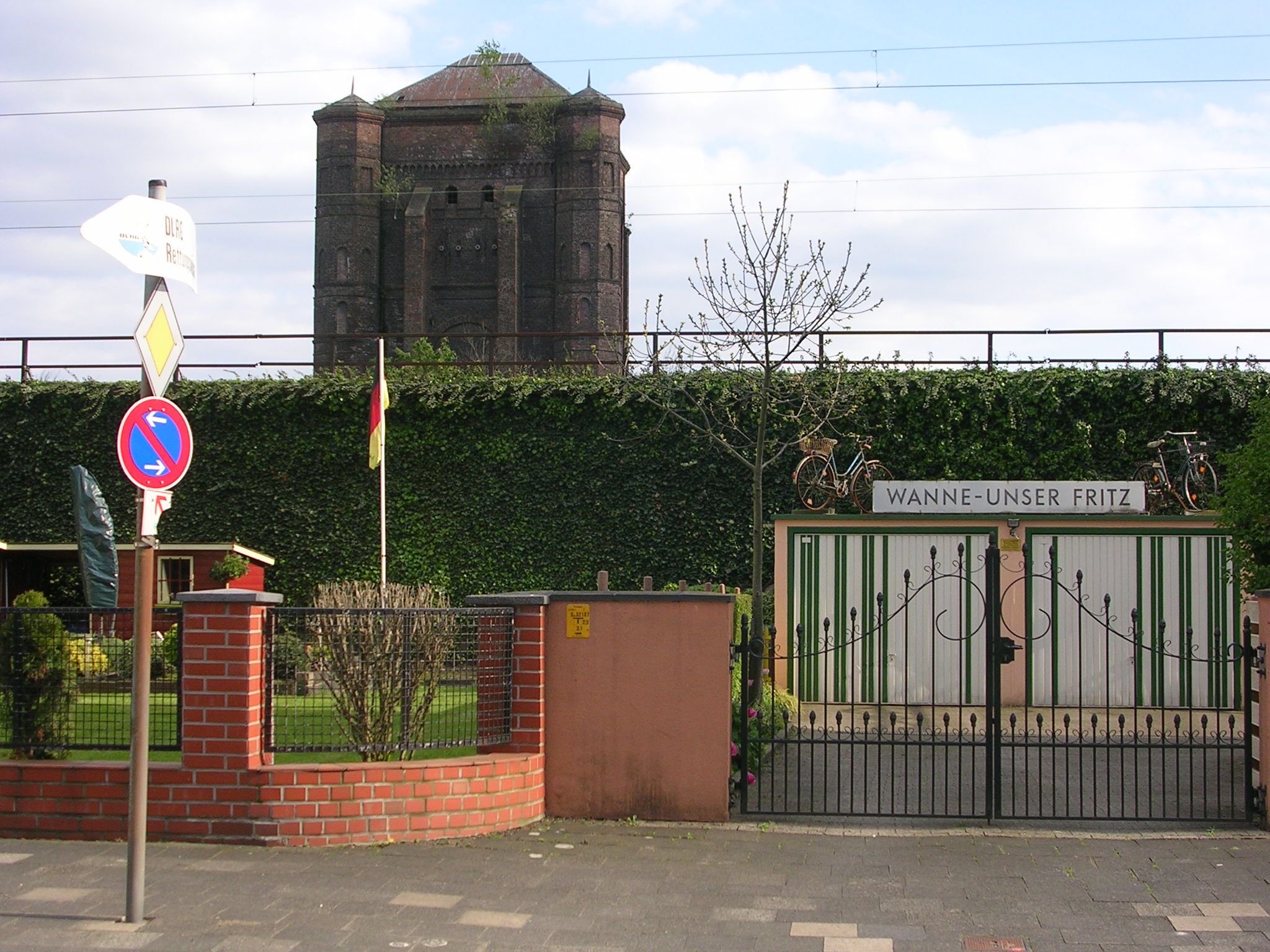 Falcsh. da steht der Name des ehemaligen Haltepunktes der Bahnstrecke auf dem Bild. Das Schild hatte nach Schließung des Haltepunktes wohl jemand gemopst und auf seine Garage geschraubt.Der name des Turms, steht doch groß dran: Wanne