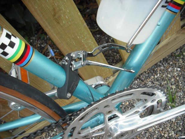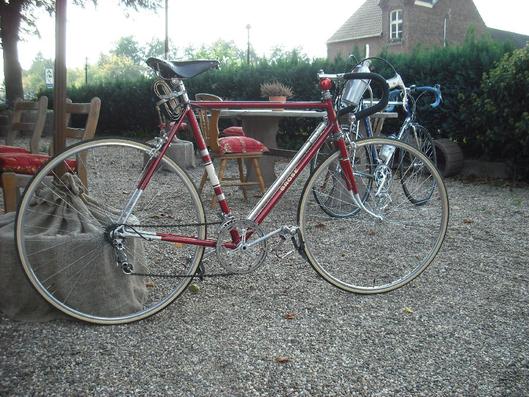 Schwer zu sagen... Blechausfaller, abgeflexte Pumpenhalter und da wo ein Steuerkopfschild sein sollte, ist nur ein Bayerwapperl. Der ganze Rahmen ist in Hammeritblau angepinselt. Dafür aber Super Record/Record, Unicanitor und Cherry Bremsen. Recht unbekannt zwar aber bremsen richtig gut.