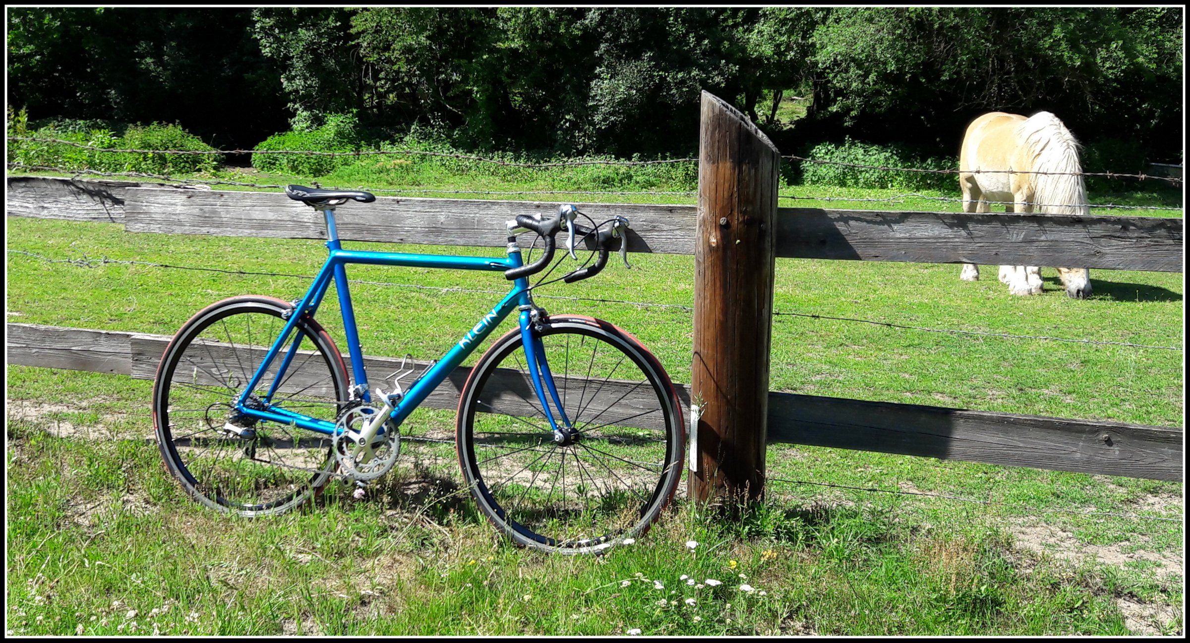 Schneller Technikabriss vorneweg: Neu in der Ausstattung im Vergleich zum letzten Jahr im Tessin ist der Campa Record 28-loch Laufradsatz an wiederum bewährten HplusSon TB14 Felgen. Reifen sind die aktuellen Challenge Elite Pro Open in 23mm, die auf der breiten Felge doch etwas mehr Volumen bekommen, so dass es keine 25er sein müssen. Für das geplant bergige Terrain mit einem Suntour Winner Pro 14-30 bestückt. Vorne 41/52 TA Competition Blätter, schaltet tiptop mit Campa C9 Kette, und geht gut bergauf. Zweiter Flaschenhalter per Schellen - gibts fertig mit aufgelötetem Gewindestück von King Cage. Gesamtgewicht ohne Flaschen jetzt 8,7 kg. Zuletzt noch eben neues Lenkerband gewickelt, eh klar.