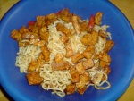 Salat mit angeschmorrten Zwiebeln, Knoblauch, Sonnenblumenkernen und gewürfeltem Tofu. Natürlich noch warm aus der Schüssel essen.
