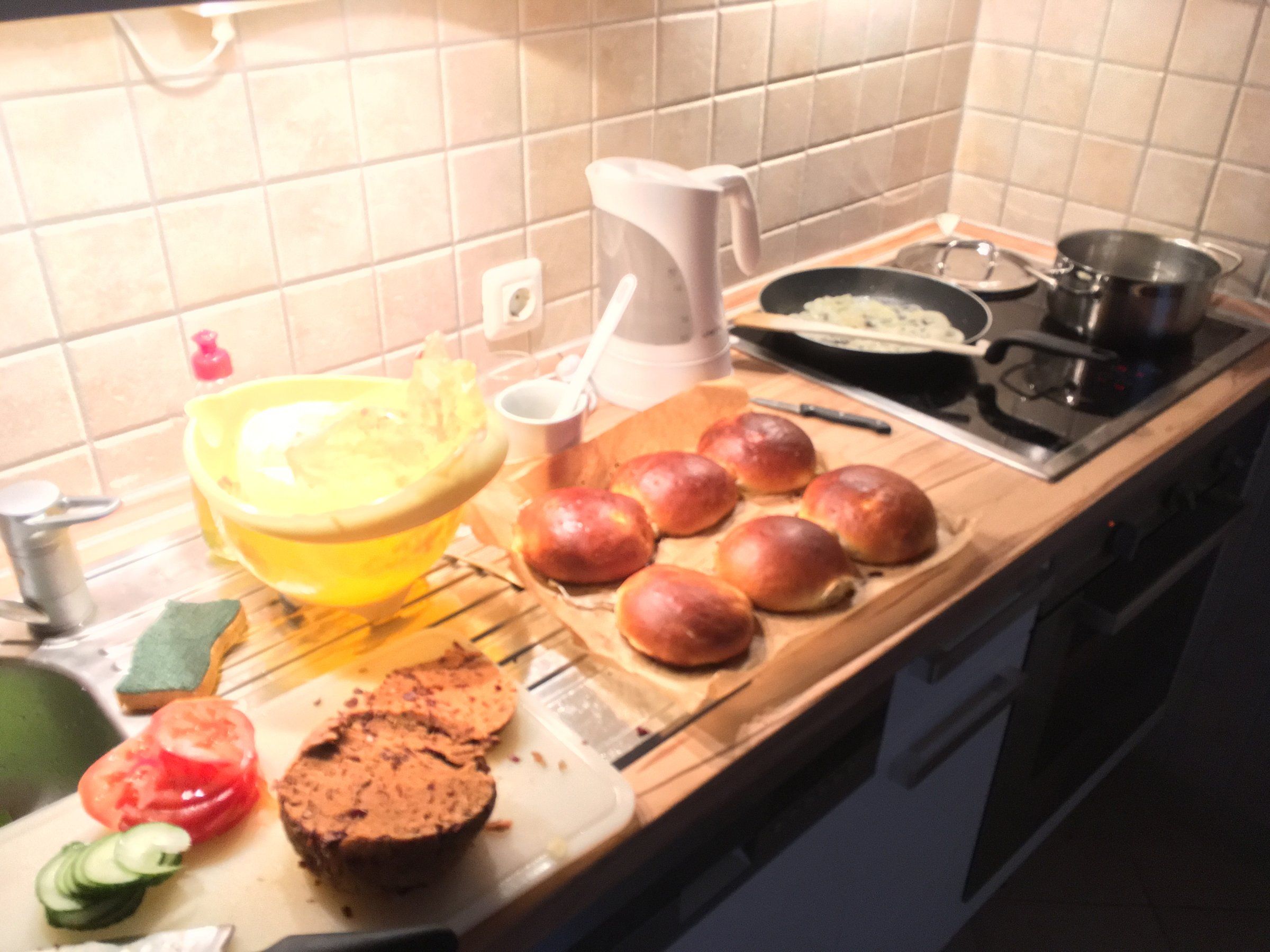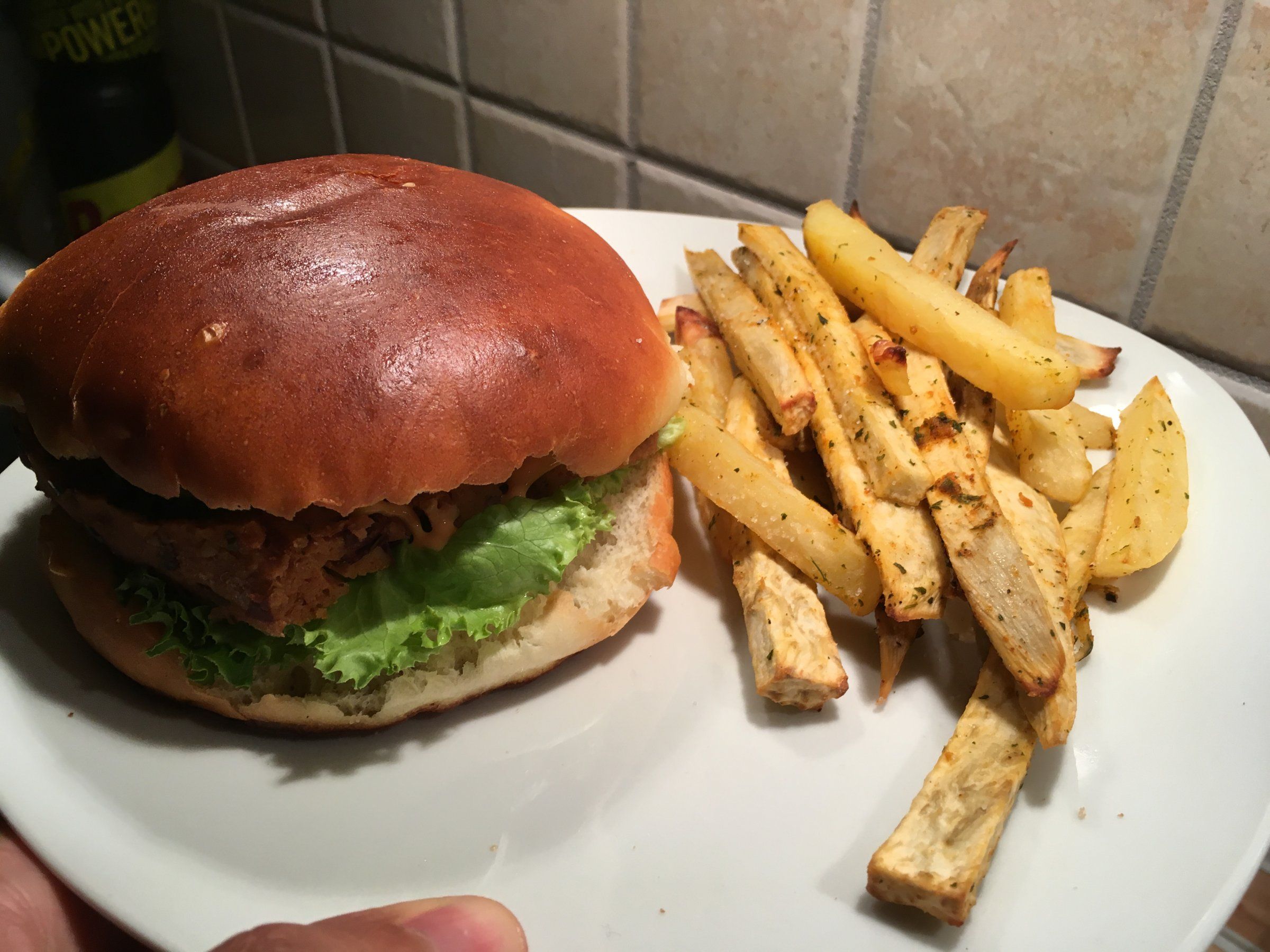 Also zum ersten mal Burgerbrötchen gemacht. Und als Patty einen Braten aus Seitan und Kidneybohnen gemacht. Dazu viele frische Röstzwiebel und ein Chutney. Als Beilage Kartoffel/Süßkartoffelpommes.