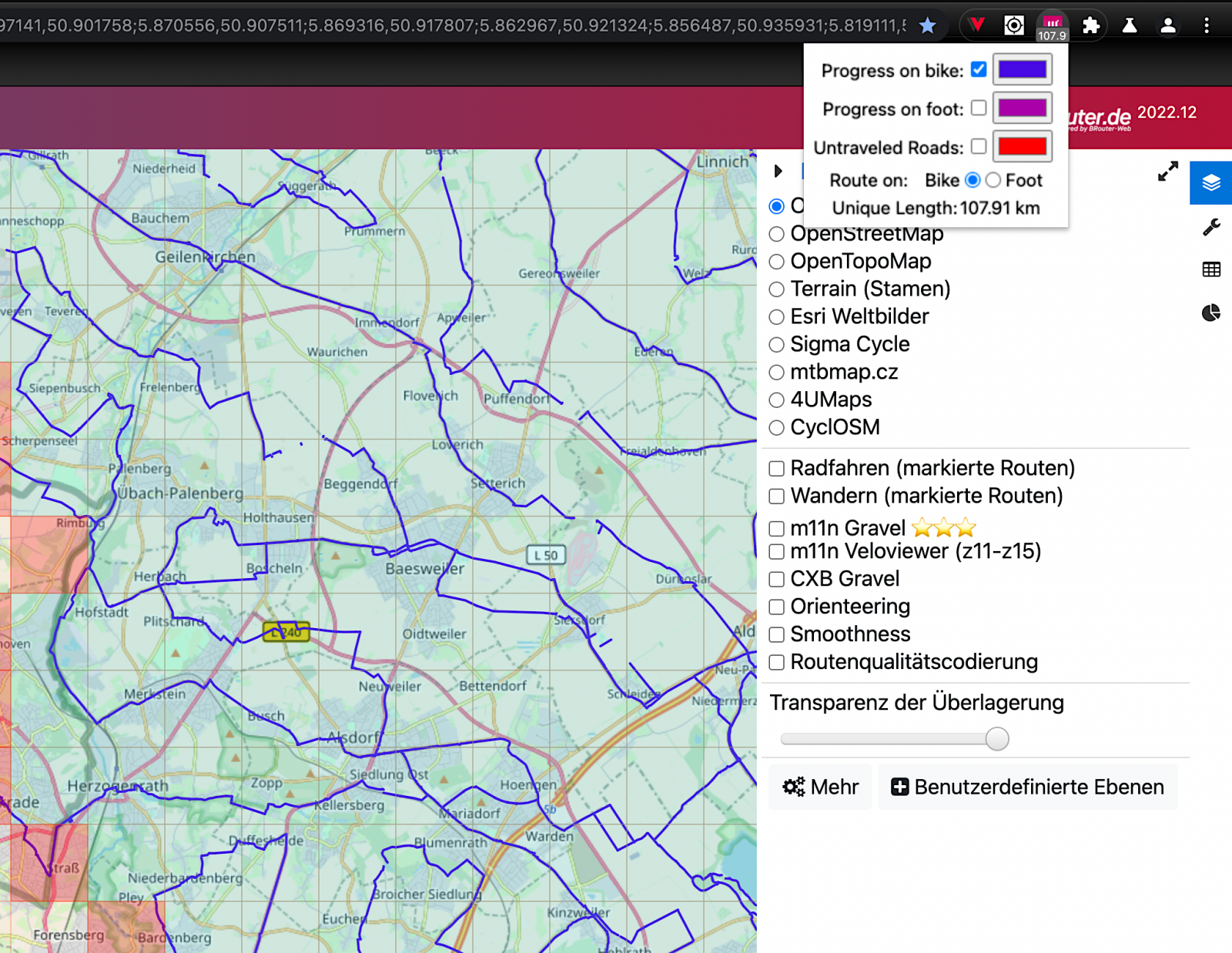 Und wieder eine erfreuliche Neuigkeit im Bereich technische Unterstützung bei der Routenplanung: nach dem letzten Update des Statshunters-Add-On kann man jetzt seine kompletten Aktivitäten als Overlay einblenden. Beispiel aus BRouter: