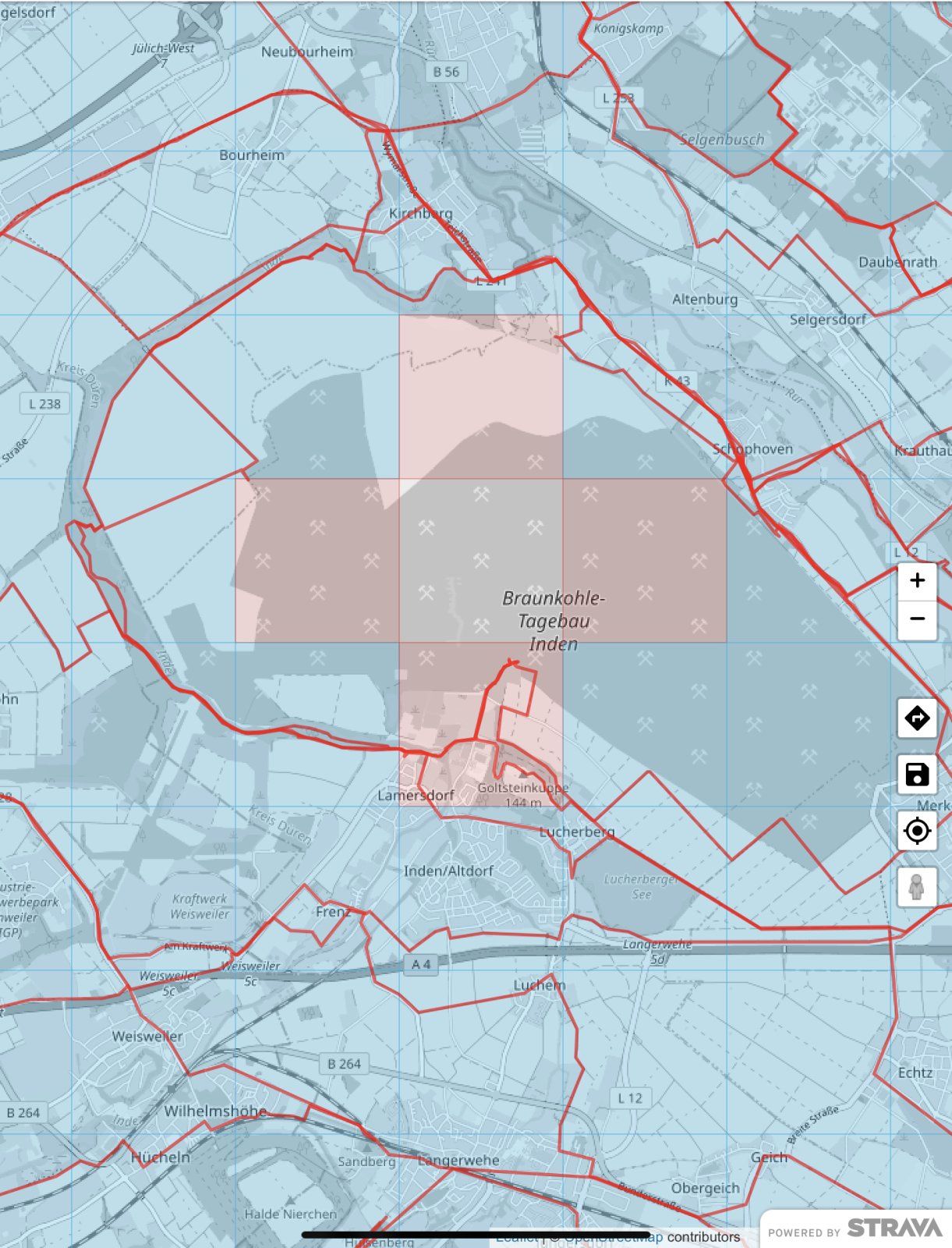 Wie schon oben angedeutet. Die mittlere Kachel im Screenshot (blau umrandet) ist nicht legal zu erreichen. Aus dem Restloch soll später ein See werden. Also ist fraglich, ob man dort per Rad jemals wieder hin kommt. Ohne meine Aufzeichnung von 2005 wäre für mich da ein blinder Fleck.