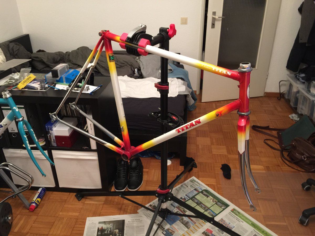 Die Dura Ace am Titan macht sich auch gut. Aber dann bitte muss schon eine 7400 Kurbel her, finde ich ;) Hinterbau aufbiegen geht klar. Kannst dir auch beim Rahmenbauer Gesta in Köln dauerhaft auf 130 biegen lassen.