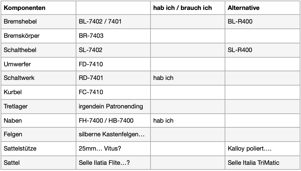 So das Winterprojekt (okay, eins der Winterprojekte...) steht: Das Vitus bekommt einen Neuaufbau mit Dura Ace 74xx Gruppe, 2x8 (hat ja schon 130mm EB) mit Rahmenschalthebeln!