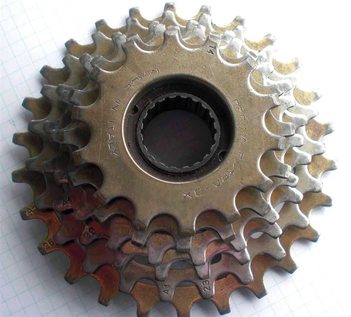 Ritzel demontieren, Freiläufe auseinandernehmen, Teile in Ultraschall mit Diesel waschen, Freiläufe mit Fett wieder zusammenbauen, überschüssiges Fett in den fertig montierten Freiläufen wieder im Dieselbad herausspülen, trocknen lassen, Freiläufe mit Öl schmieren, Roststellen und Dreck auf den Ritzeln mit 000-Stahlwolle entfernen, Dreckrückstände auf den goldfarbenen Ritzeln noch mit Dremel-Nylonbürste entfernt und mit Polierpaste und Chrompoliermittel aufpoliert…