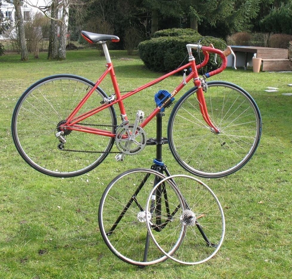 hier hab ich ein altes Colnago Sport (ich weiß, die sind noch wertvoller als die echten!) vorm Verottungstod gerettet. Das Radl stand jahrelang auf dem Fahrradparkplatz des Verwaltungsgebäudes gegenüber, bis ich endlich mal ne Mail geschrieben hat, woraufhin sich der Besitzer gemeldet und mir das Rad für ne Spende in die Kaffeekasse überlassen hat, damit ich es retten und herrichten durfte.