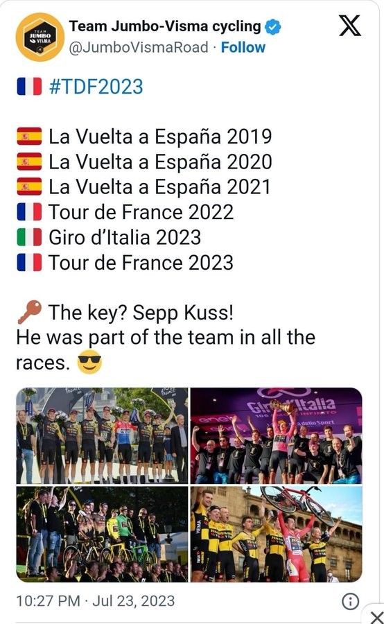 Kuss hat vor der Vuelta in einem Interview sehr deutlich gesagt, dass er keinerlei GT-Ambitionen hat und sich in der Rolle des Helfers (und damit als einen entscheidenden Faktor für die GT-Triumphe seiner Kapitäne) sehr gut gefällt. Warum sollte sich dies so massiv geändert haben, dass er jetzt quasi mit dem Messer in den Zähnen unterwegs ist und stinksauer auf seine Kapitäne sein soll? Die ganze Theatralik und das "erbärmliche" Verhalten, dass hier immer wieder zur Sprache kommt, wird von außen drauf projiziert und hat, wenn seine Aussagen wahr sind, keinerlei Bezug zu seinem Empfinden noch zum Innenleben bei Jumbo Visma.