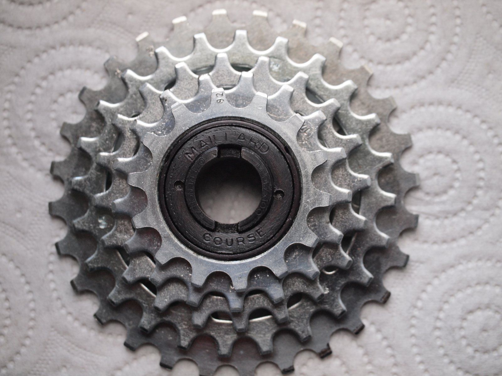 Beim ersten, bereits vor kurzem von mir hergerichteten Bauteil (ein Maillard 700 Course 5-fach Kranz) hat es zwischenzeitlich eine Änderung in der Abstufung gegeben, da ich mich von der ursprünglich geplanten Zweifach-Halfstep-Übersetzung (36/40 - 14/32) auf eine Dreifach-Halfstep-Granny-Übersetzung (26/40/44 - 14/28) umentschieden habe (auch wenn die Schaltanlage dann zu neu für den Rahmen sein wird).