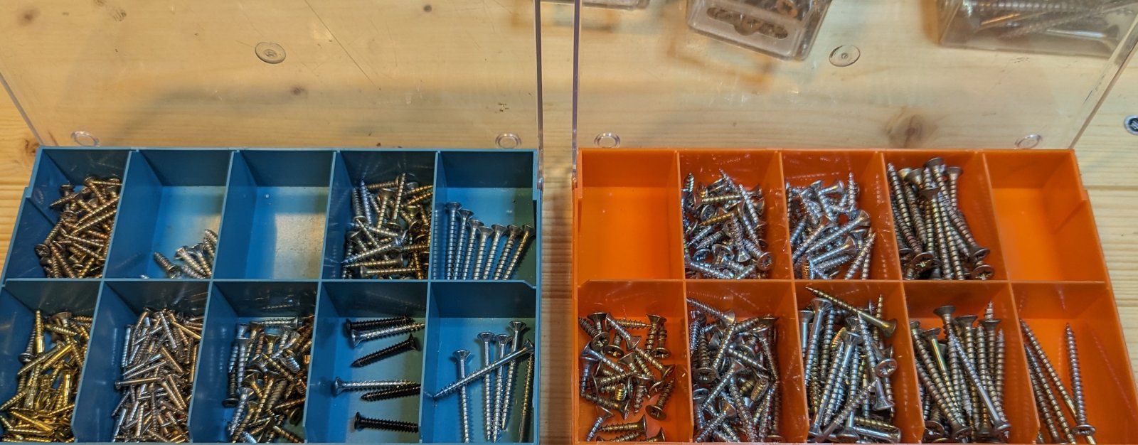 Nachdem ich das schon mit den Gewinde Schrauben gemacht habe, sind jetzt die Holzschrauben dran. Erst nach Dicke sortieren und immer die gleiche Länge ins Sortiment Kästchen.
