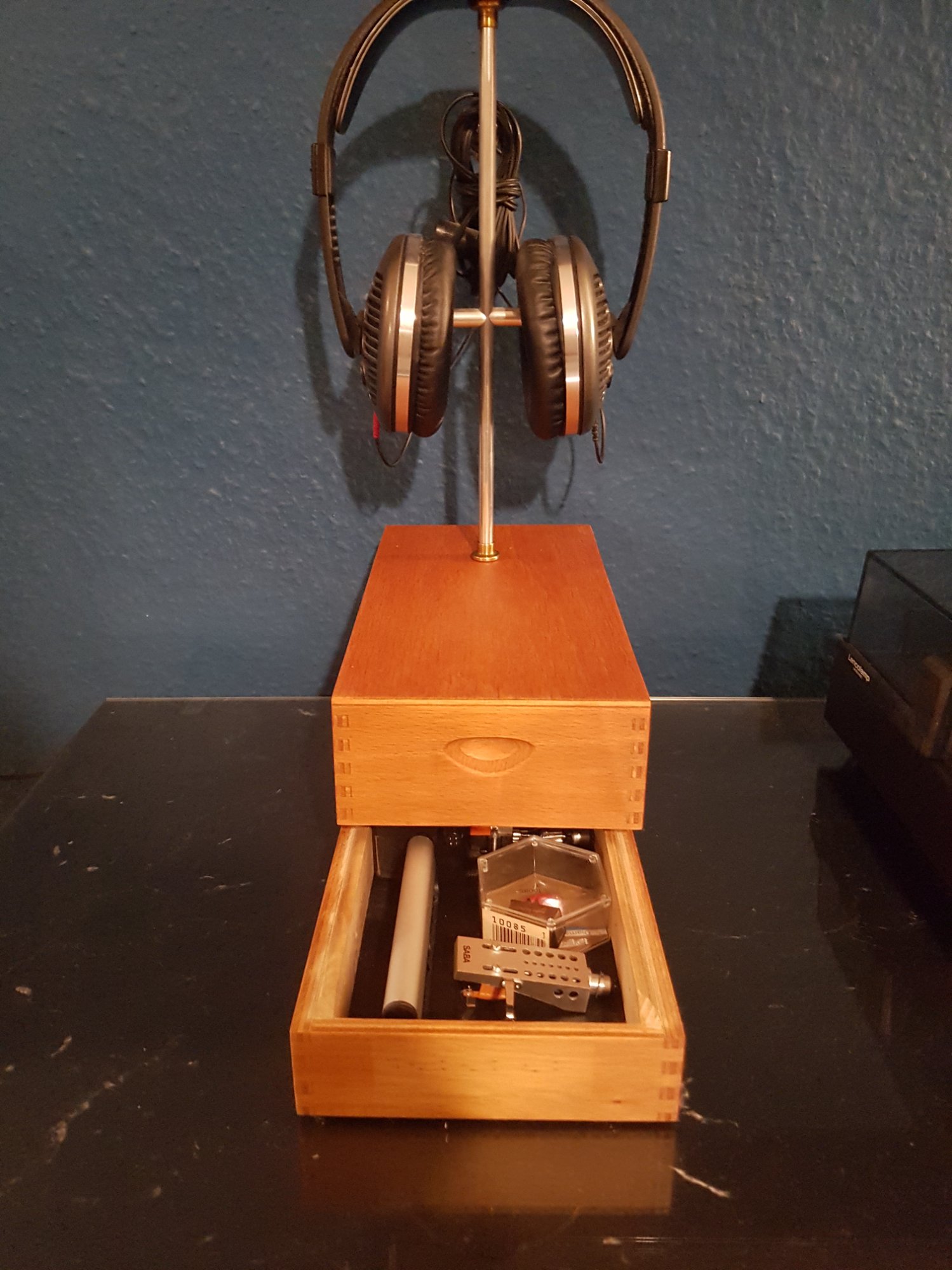 Kopfhörerständer mit integriertem Kasten für Phono Kleinkram.