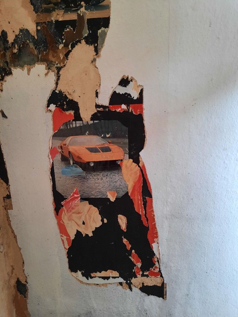 , mehrere Schichten Tapete, teilweise mit Lackfarbe bepinselt