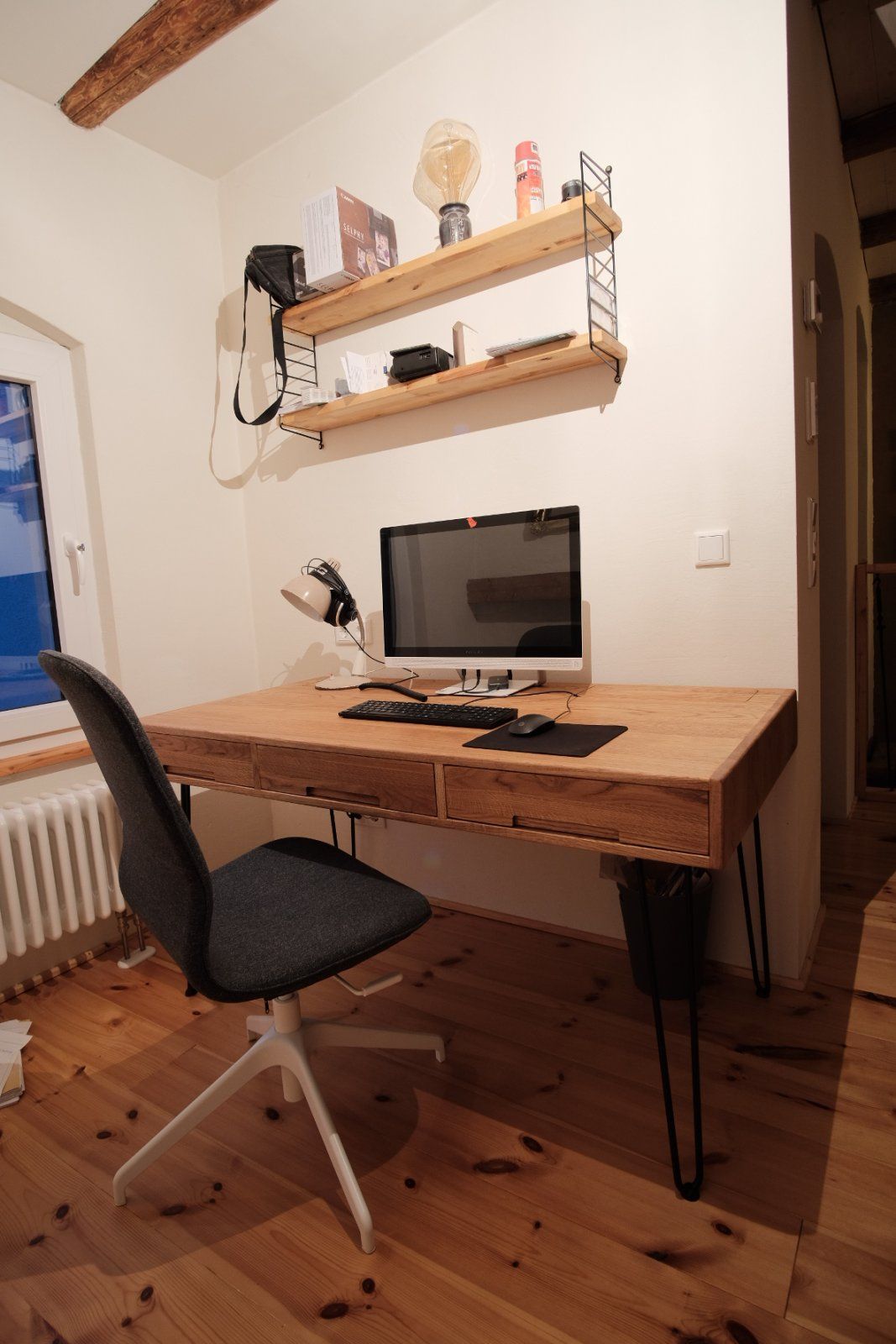 So ein "komplexes" Möbelstück (alle Tischler werden jetzt lachen) hab ich mir bis jetzt nicht zugetraut, deswegen stand das Holz jetzt schon 1 Jahr rum. Durch gehäuftes Home-Office ging mir der zu kleine Tisch jedoch langsam echt auf die Nerven. "Gimmick" sind die zwei Klappen für den hinteren Kabelschacht, bzw. Raum um die Tastatur und Maus zu verstauen, wenn man mal mehr Platz braucht. Hab alles ohne spezielle Beschläge, einfach mit Holzleisten umgesetzt (Auflage der Klappen und Auszüge).