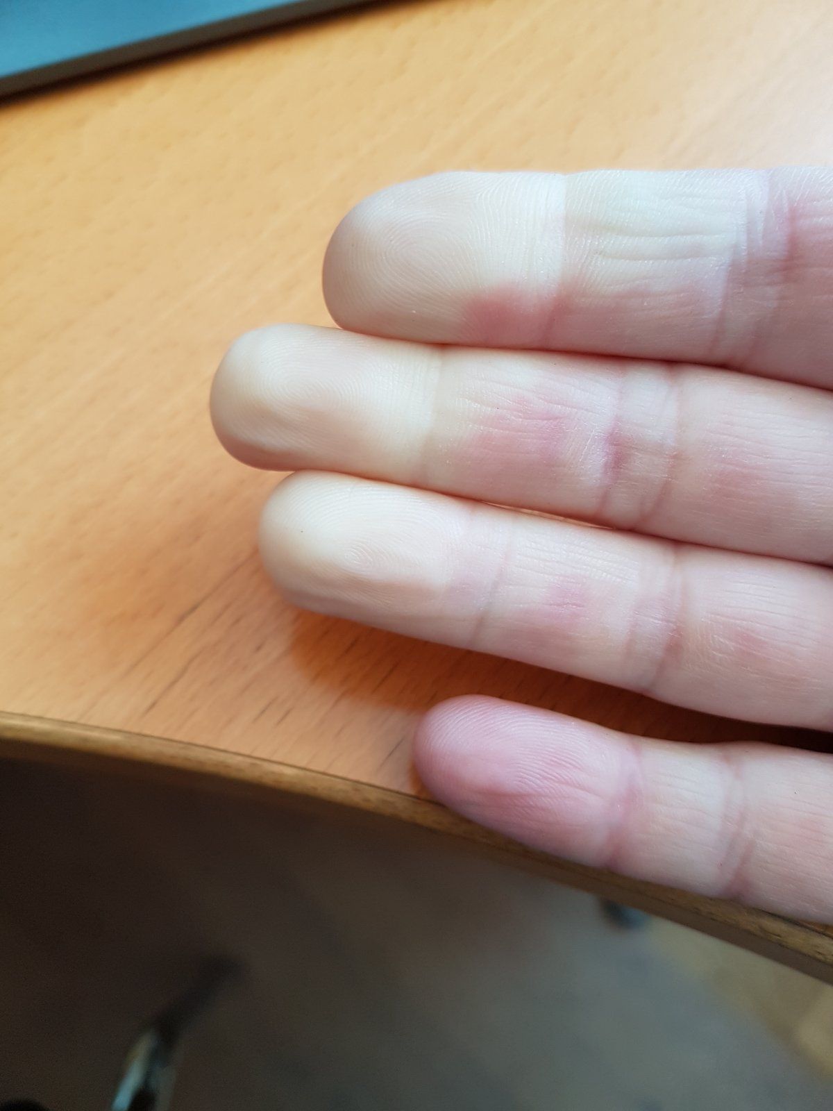 Ach, das ist ja interessant: Finger wie an einer Linie abgeschnitten kalt + weiß + wenn das Blut zurück kommt manchmal rot pochend und schmerzend -- das hatte ich auch schon ein paar Mal. Recht unangenehm.Raynaud-Syndrom