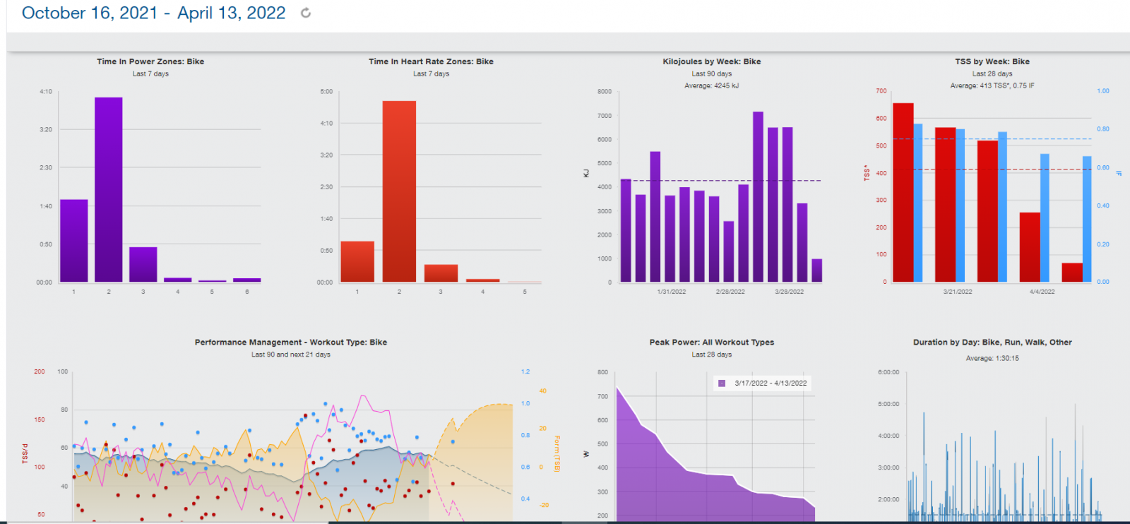 @hometrails Hier der Chart zeigt Umfang und Intensität über 5 Wochen. Die 5. Woche läuft noch.Sowas gibt es natürlich differenzierter als Du Dir das gerade vorstellst. Man hat ja ein Dashboard mit verschiedenen Parametern im Zeitverlauf. Alles zusammen addieren funktioniert aber so, wie alle Farben in einem Wassermalkasten zusammen zu mischen.