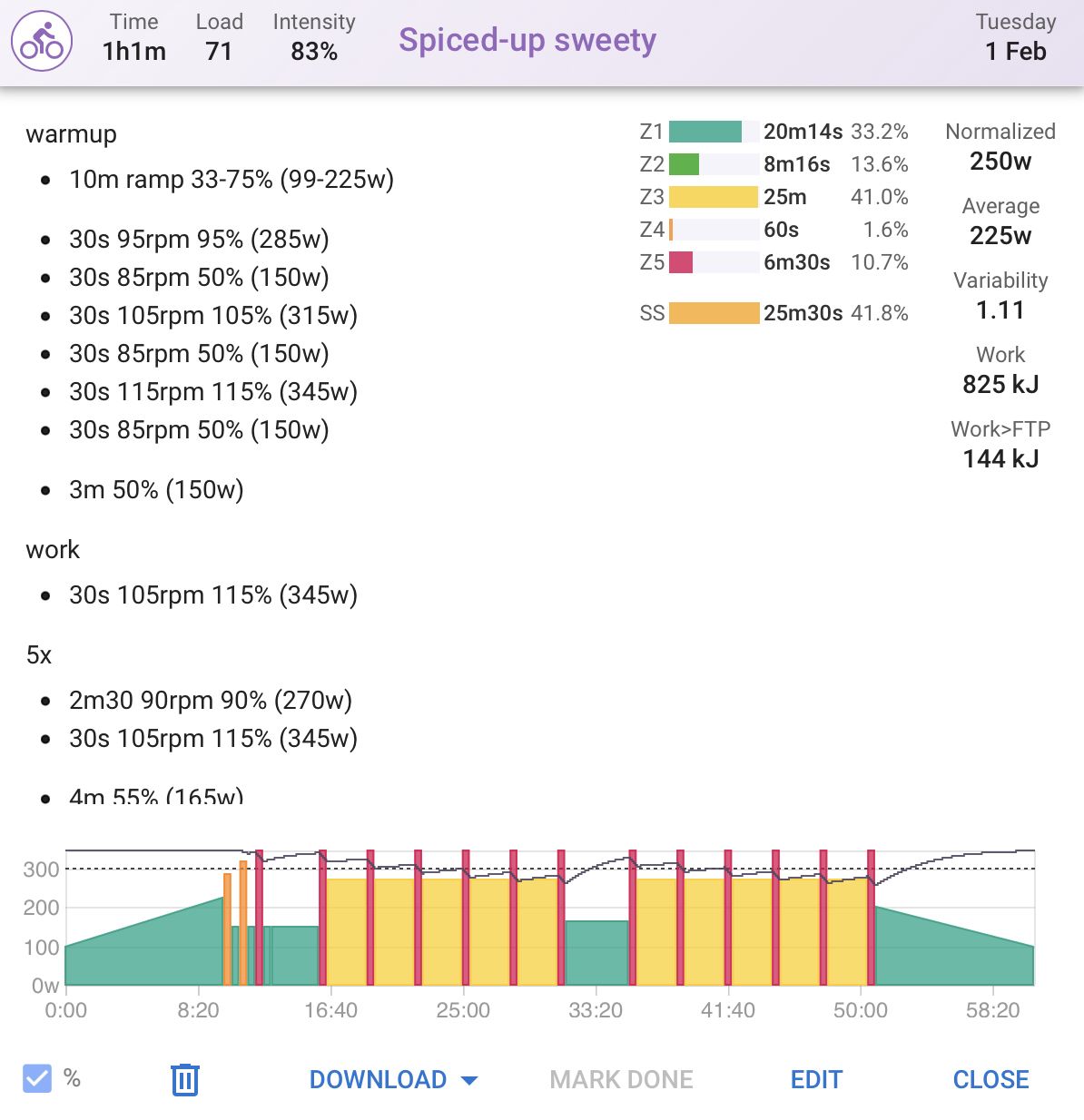 Jetzt habe ich mir überlegt noch eine SweetS-Woche dranzuhängen und die Regenerations-/FTP-Test Woche zu verschieben. Auch die Intervalllängen möchte ich nochmal um 2-5min erhöhen, wobei ich dann aber langsam am persönlichen Max. angekommen bin. Da ja eigentlich jeweils 4 Wochen SwSp, 4 Wochen FTP und 4 Wochen Vo2 max geplant waren werde ich jetzt eher 5w SwSp und dafür nur 3 Vo2 max machen.