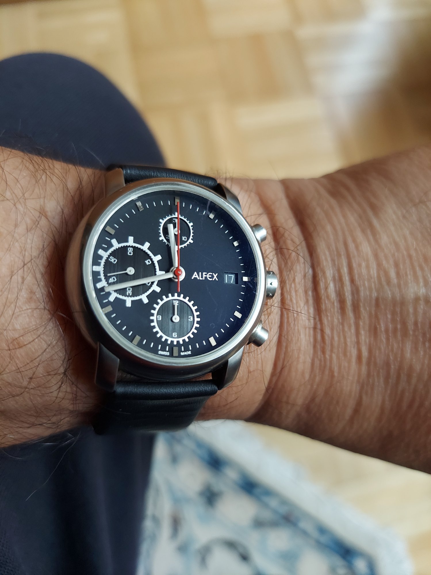 Vielleicht hat er ja eine richtige Uhr am anderen Handgelenk?