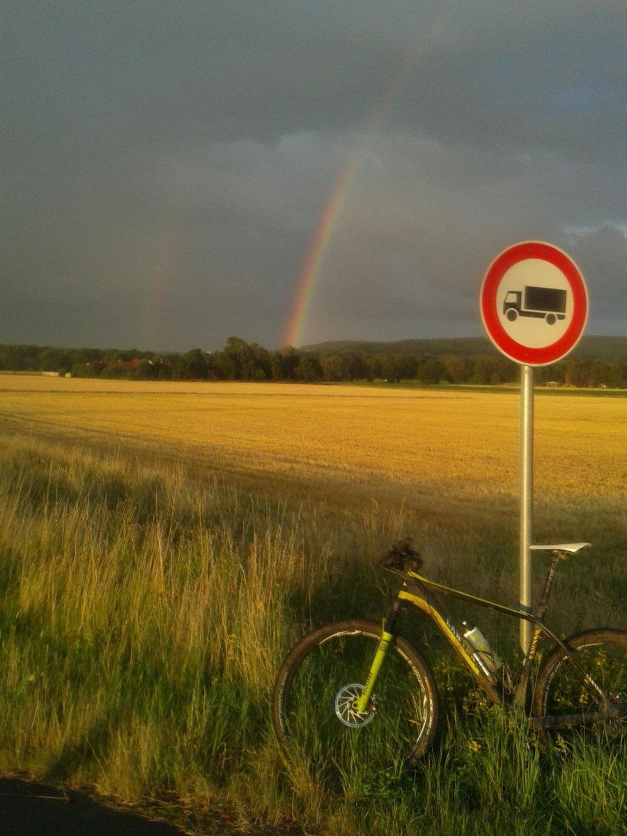 Rückzu tröpfelte es schon beim aufsatteln.. Laut Wetterradar zieht da ne mächtige Regenfront herran, genau in die Richtung in die ich auch will. Könnte also davonfahren.. Gesagt getan. Druck gegeben, soweit es die Strecke hergab. Alles im sitzen gefahren, bis auf einen Antritt (zum Test wie platt die Beine denn wirklich sind). Machte dann 247Wavg. über 25min.. inkl. Trittpausen wegen 90° Kurven, Torkelradlern, Singletrail durchs Wäldchen..