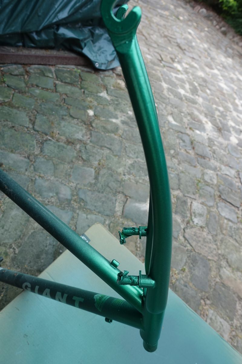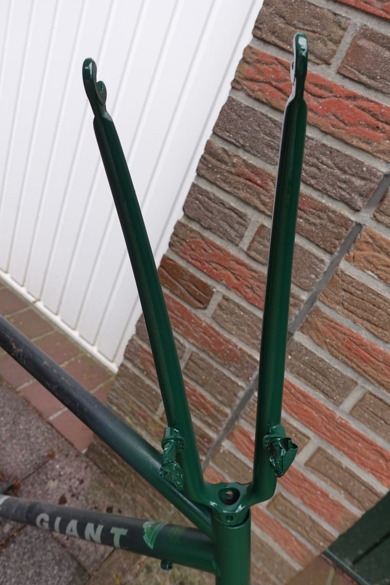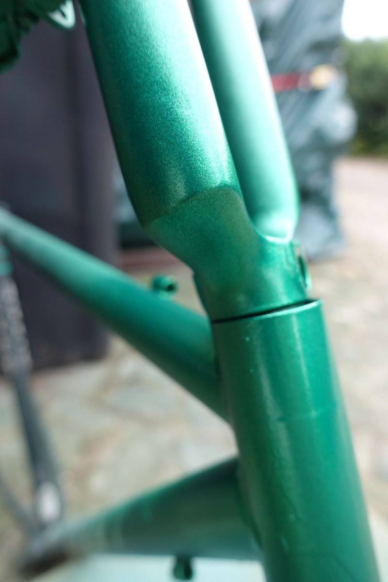 Heute war das Lackieren der Gabel angesagt, weil ich gespannt war, ob das "Moosgrün" funktioniert. Der Rahmen ist wieder unterwegs. Das Ergebnis hat mich aber nicht überzeugt. Das Grün gefällt mir, aber ich fand es zu dunkel an dem Rad. Evtl. ist der Rahmen auch zu klein für die Farbe.