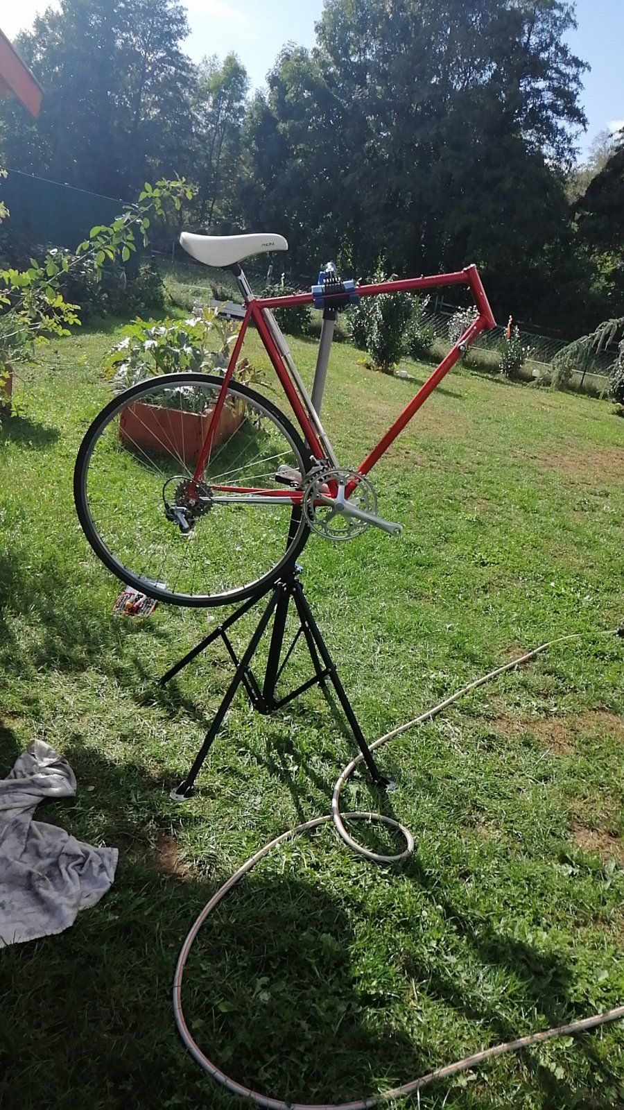 Derzeit wiegt es 9,7kg, wie abgebildet. Und dabei fehlen noch Shifter (XT 8fach-Rapidfire, ST-739), Schaltwerk (XT, RD-737), Kette, Seitenständer, 1fach-Kurbel, Pedale und die vordere Bremse sowie das gesamte Zug-Gedöns...