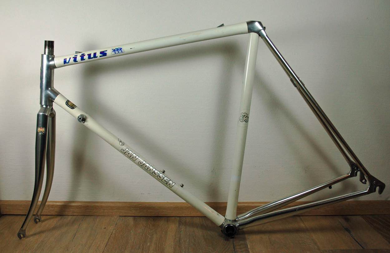 Fast zu Beginn meiner Sammelleidenschaft lief mir ein Vitus-Rahmen von Jan Janssen über den Weg. Bis heute ist er als Alu-Rahmen der Exot in der Sammlung geblieben. Vielleicht hat es auch deshalb so lange gedauert ihn zu komplettieren. Nun noch die Schaltzüge und Einstellarbeiten und dann geht es zur Jungfernfahrt