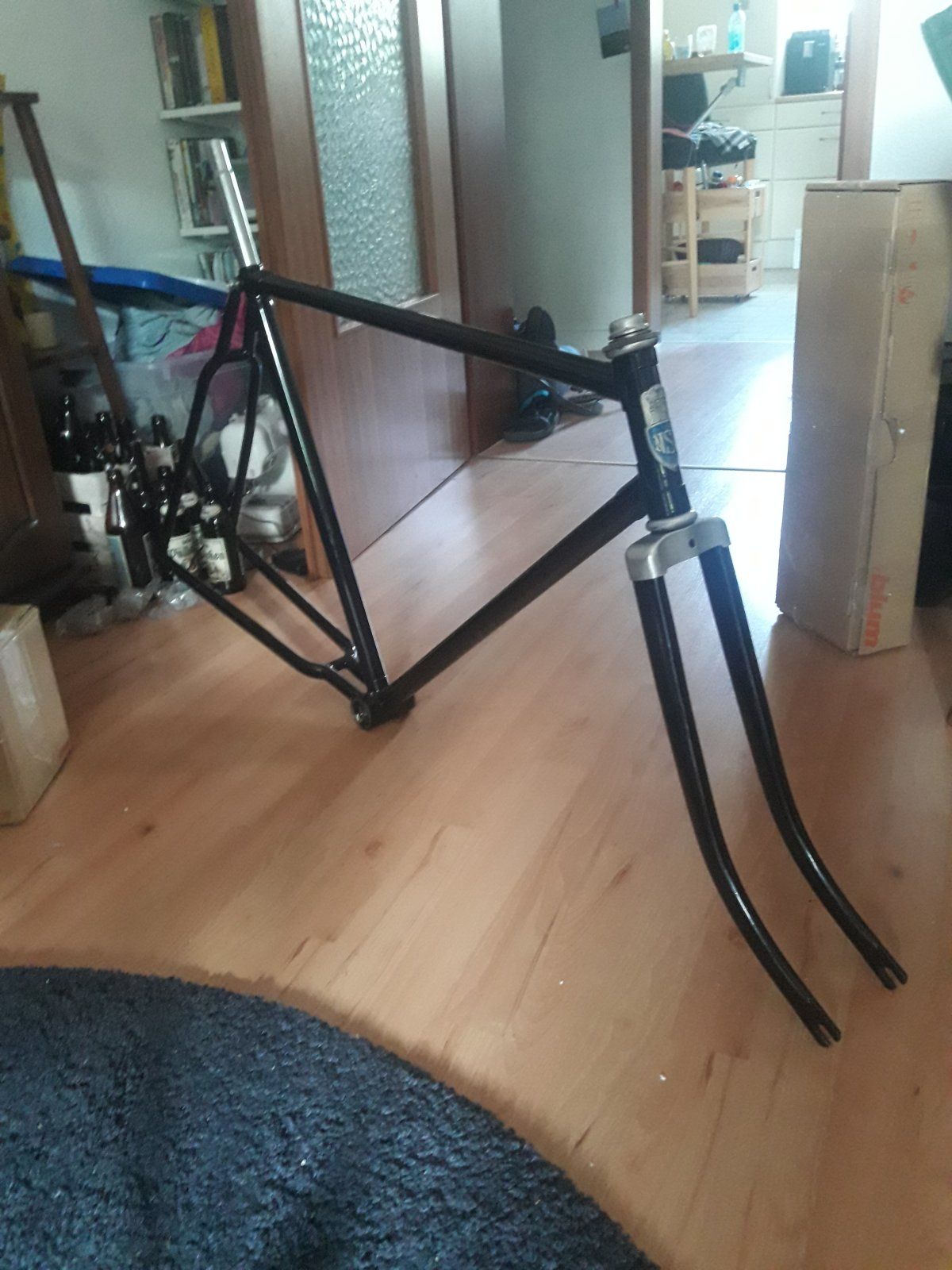 Übrigens ist der neue Rahmen von NSU (Baujahr 1949, Rh56) mit dem vorherigen Rahmen von Möwe aus Mühlhausen (Baujahr 1956, Rh54) komplett Baugleich. Es passte alles exakt dorthin wo es auch vorher gesessen hatte. Radstand, Bremsmaß und Sattelstütze stimmen ebenfall überein.