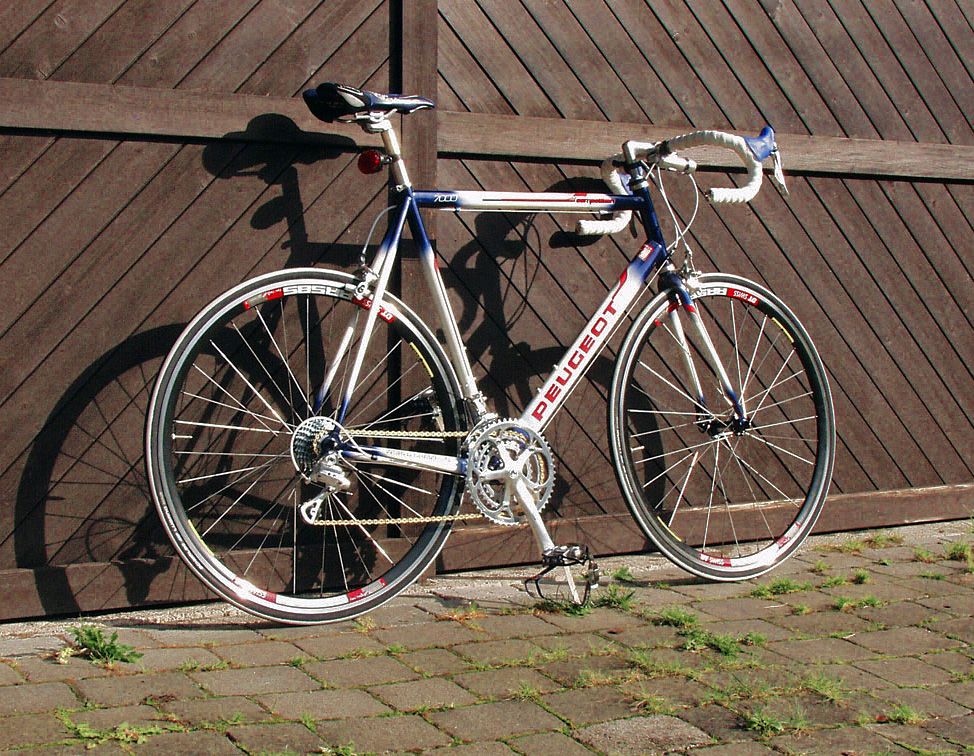 Peugeot Competition Rahmen, schon 'modern' gelötet. Dazu ein Suntour/Shimano Combi. Suntour Cyclone Teile die ich nicht fürs Villiger brauche, Shimano Ultegra Laufräder und Sakae Compactkurbel. Das ganze Rad ist vor allem als Experiment gedacht.