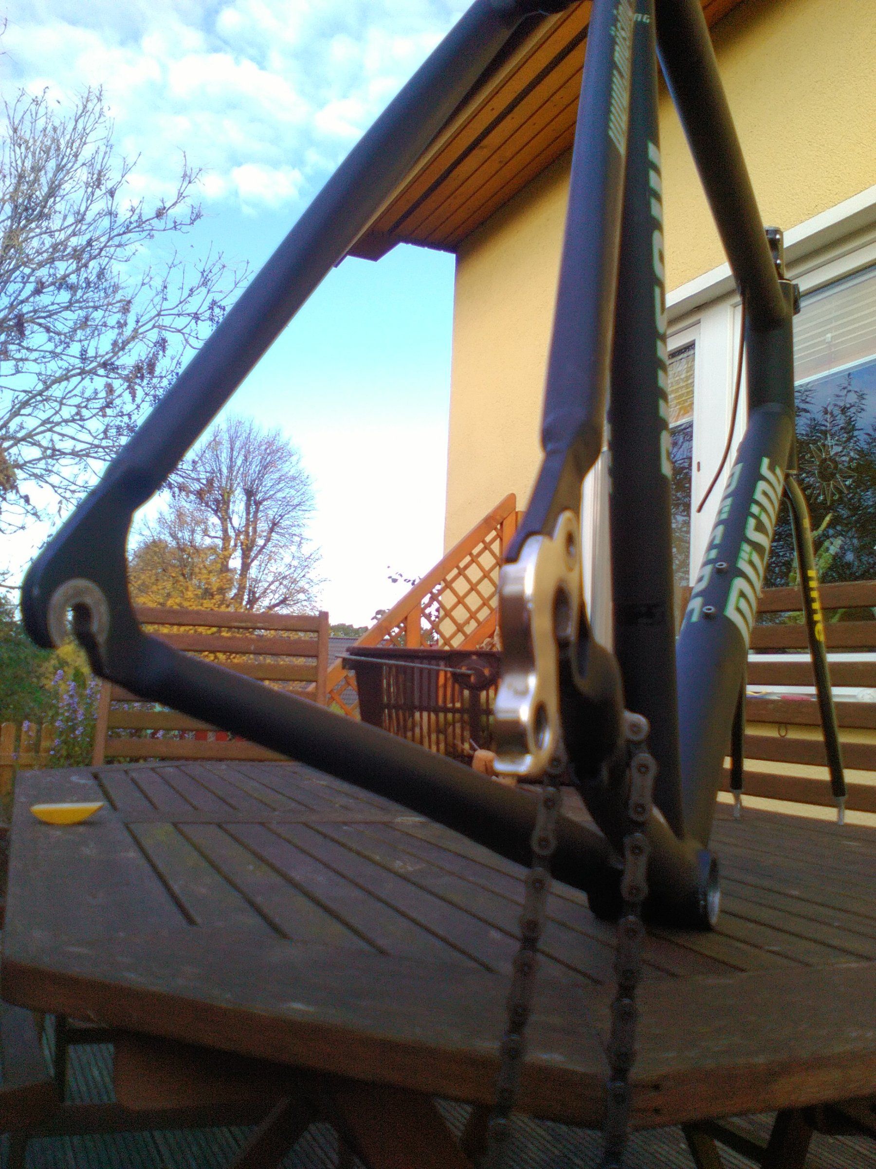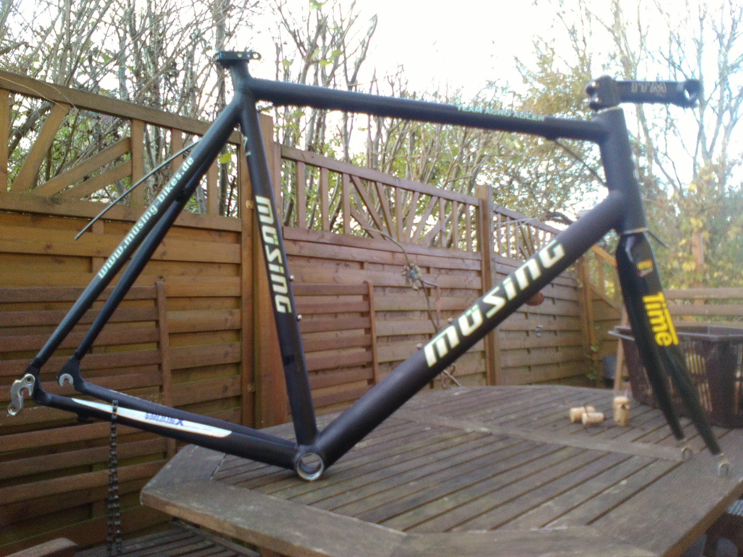 Ich kann ein MÜSING Team Agro-Adler Brandenburg anbieten. RH 59m-m und OR 59m-m, geschweißt aus feinstem Aluinium und veredelt mit einer Time Carbon-Gabel. Inkl. Steuersatz und ITM 260 Vorbau. Leider habe ich meine Kamera gerade nicht vor Ort, darum nur Handyknipsenbilder: