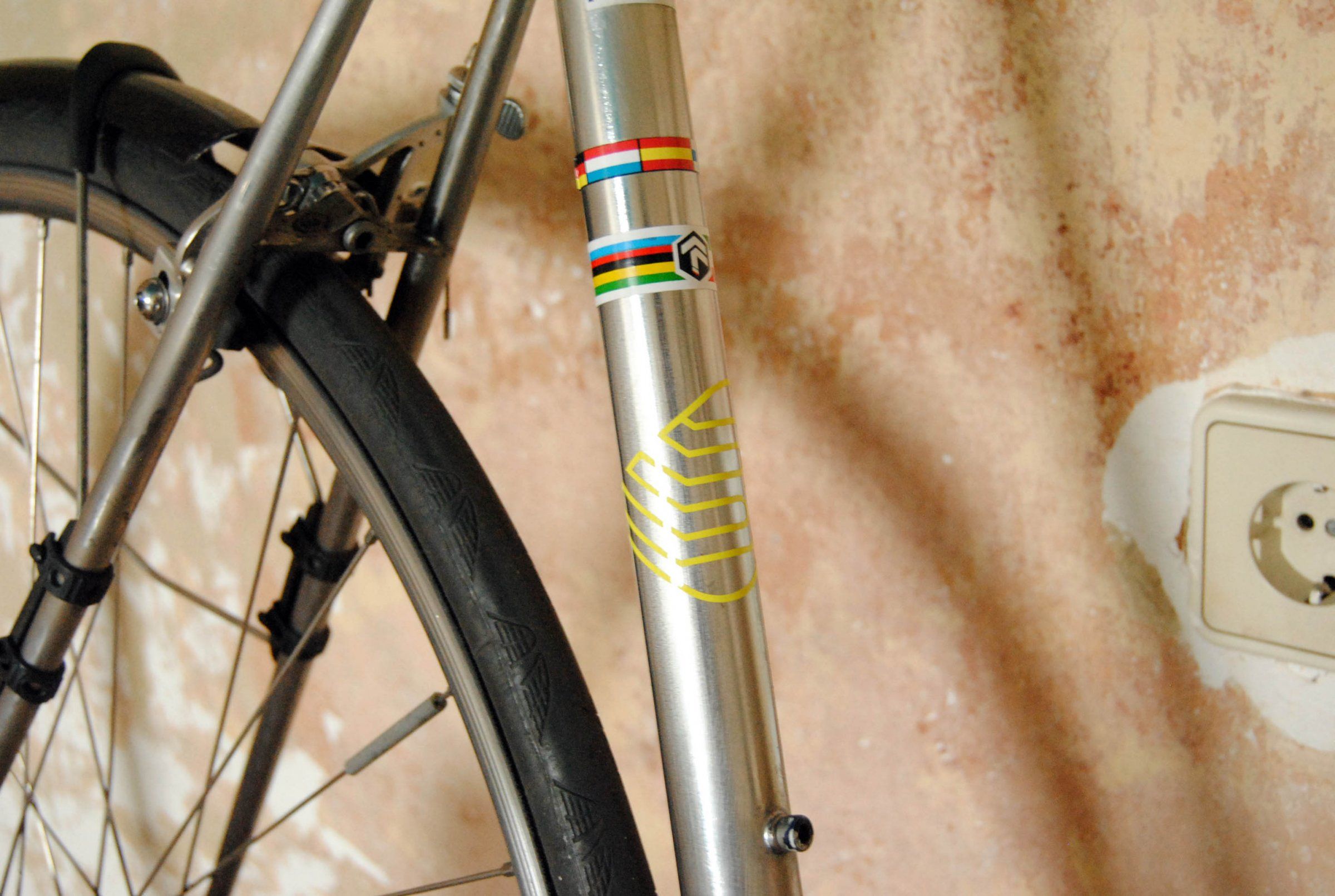 Hat gerade Streben, An'löt'umwerfer, ita. Tretlager, vermutlich geklebte Tange Gabel, Rahmen-Nr. an Sattelstrebe links unten (leider unlesbar, da zulackiert/gepulvert), Sattelstützenklemmung per Schelle.