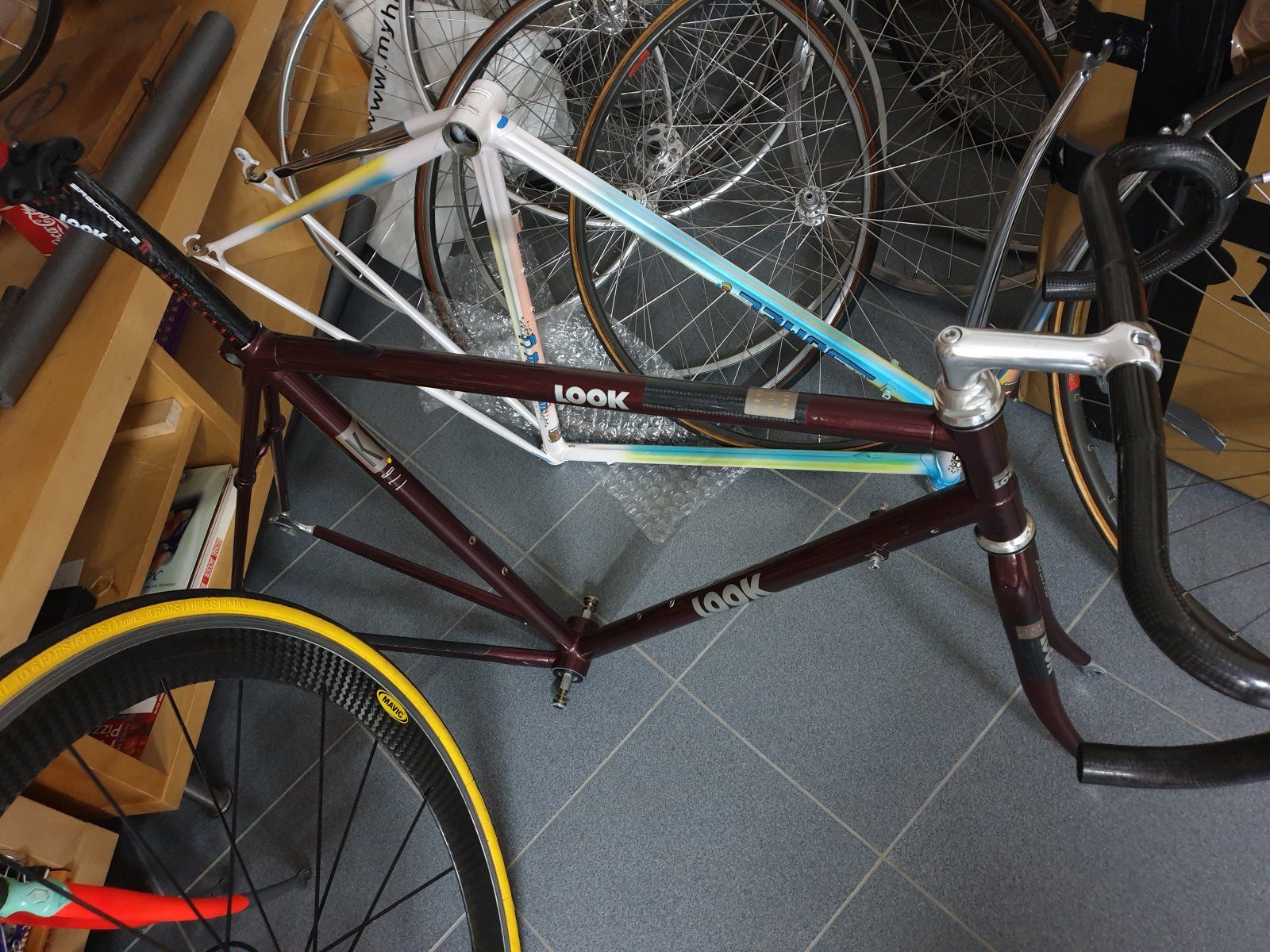 Stimmt, das ist ein KG 76, ist den Nachfolgern aber stilistisch schon sehr ähnlich. Vermutlich sind die neueren noch etwas optimierter, mir reicht das aber vollkommen. Das Rad wurde mir von einem netten Forumskollegen hier in Berlin vermacht und darf ohne den Aufkleber bleiben.sorry - aber das ist ein LOOK KG 76 Hinault aus LOOK's Anfangsjahre- kein KG 176. Das KG 176 ist komplett lackiert mit 2 Stellen Sichtcarbon auf dem Oberrohr und an der rechten Gabelscheide … ist aber auch schön, leider hab' ich keinen Tipp für die fehlenden Unterrohraufkleber