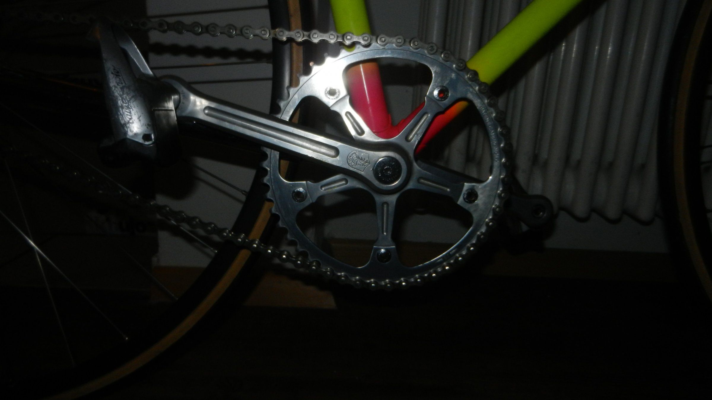 Schönes Teil. Wie groß ist denn der Rahmen? Und auf welcher Höhe ist der Sattel bei der jetzigen Einstellung (Mitte Kurbel - OK Sattel)?Durante Bahnrad ca. 90` mit Cromo Rohren . Heute fertig gebastelt. Super Record Pista Innenlager, Steuersatz und Kurbel. Gipiemme Special Nabel mit Omega 19 Felgen. Viel Schnickschnack.