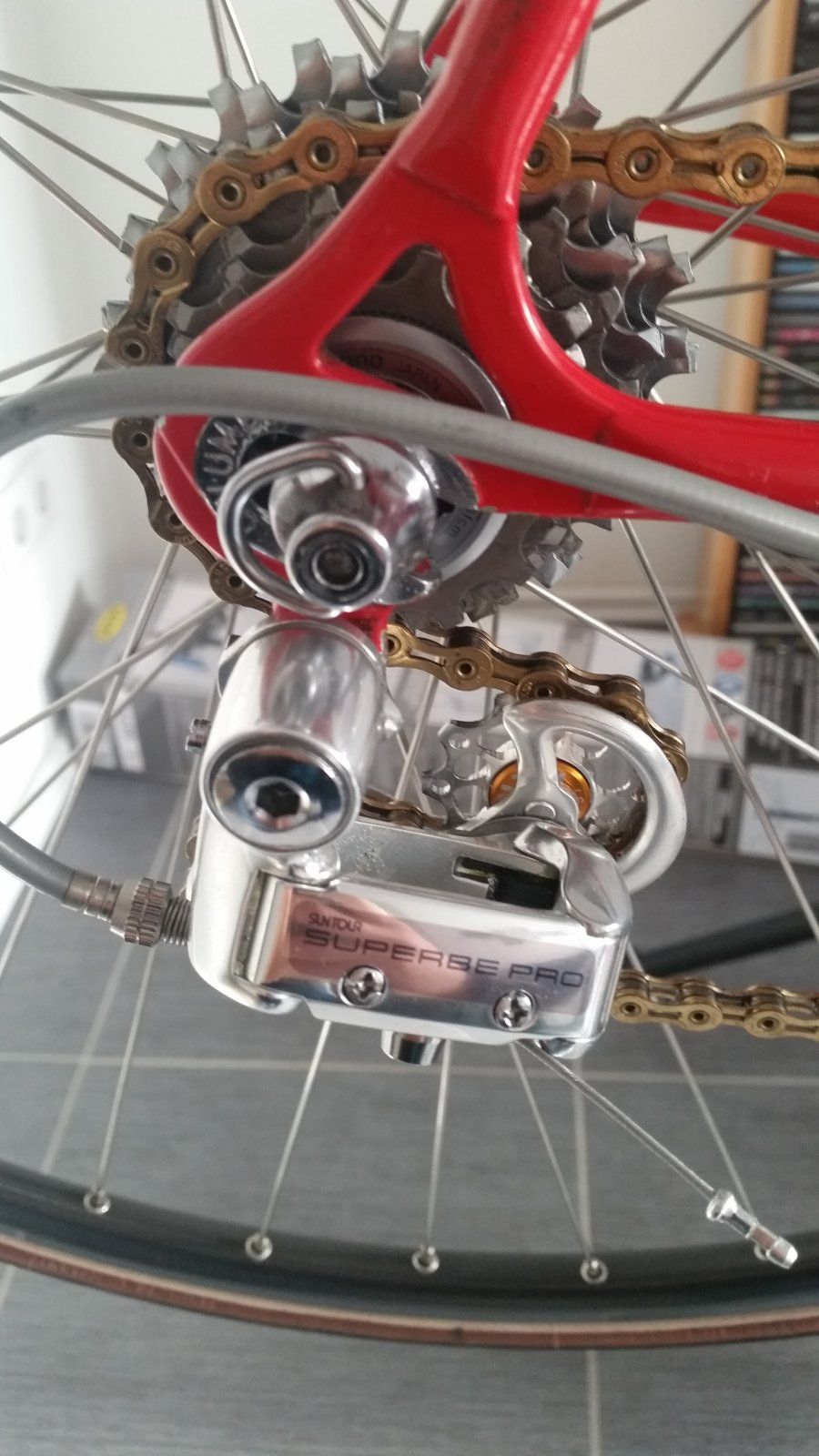 Ich habe das Rad im Originalzustand belassen und lediglich die Schaltung mit einer Campagnolo Gran Sport aufgewertet. In den 70ern wurde wohl mal eine Simplex Plaste Schaltung eingebaut, die ist auf dem Müll gelandet. Dazu kam eine andere Sattelstütze zum Einsatz, sowie ein Gepäckträger für den Alltagsnutzen.