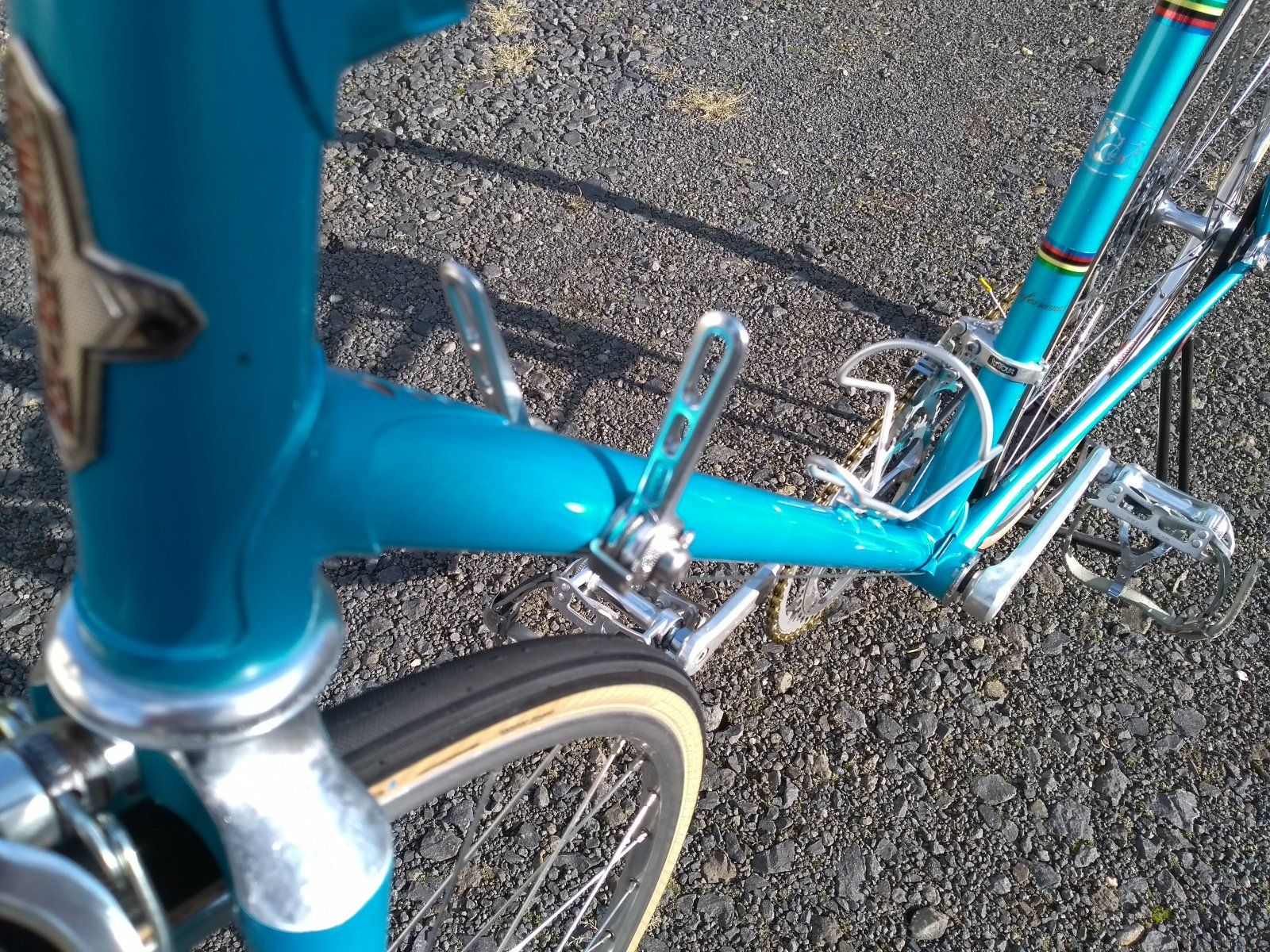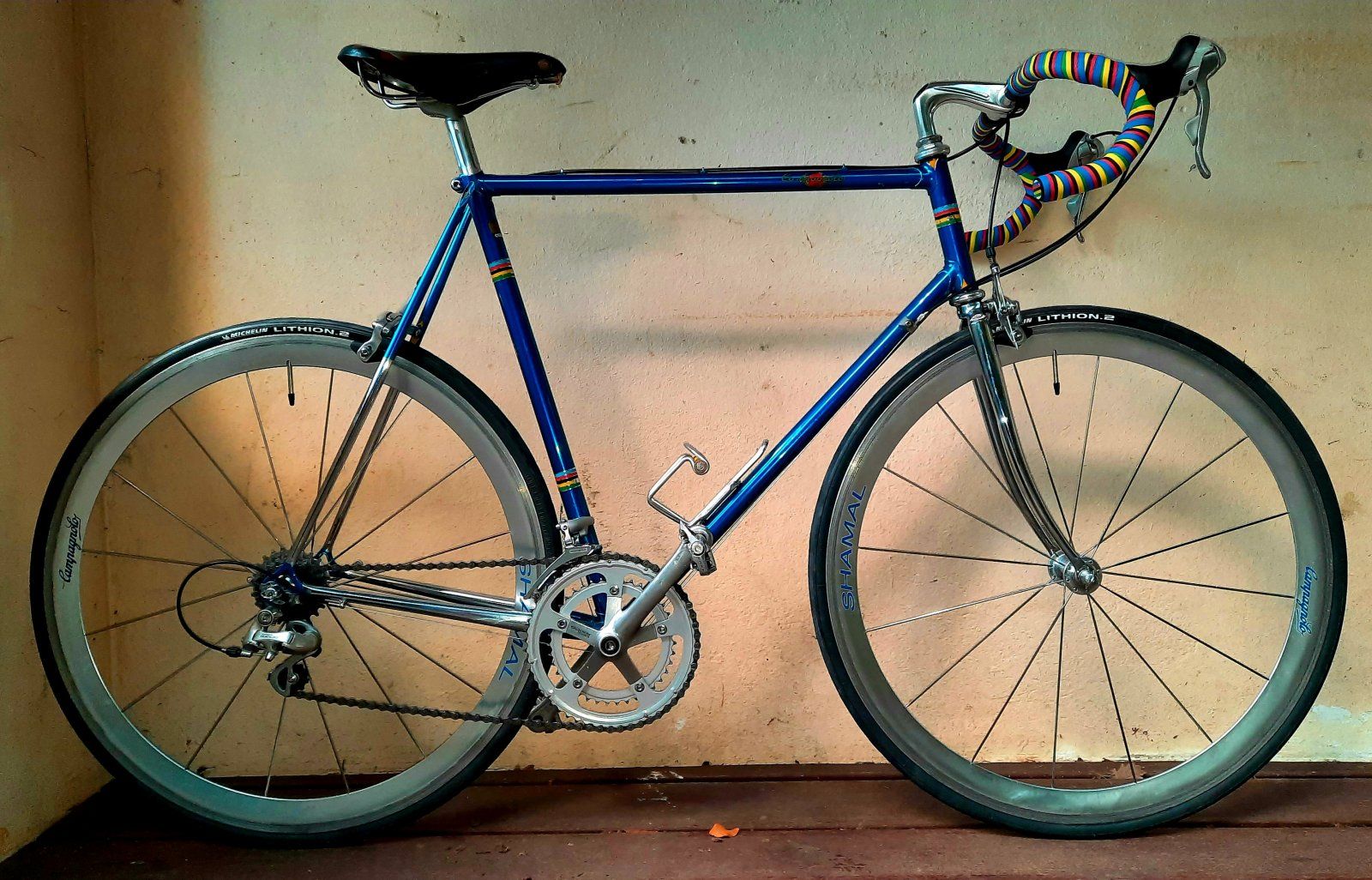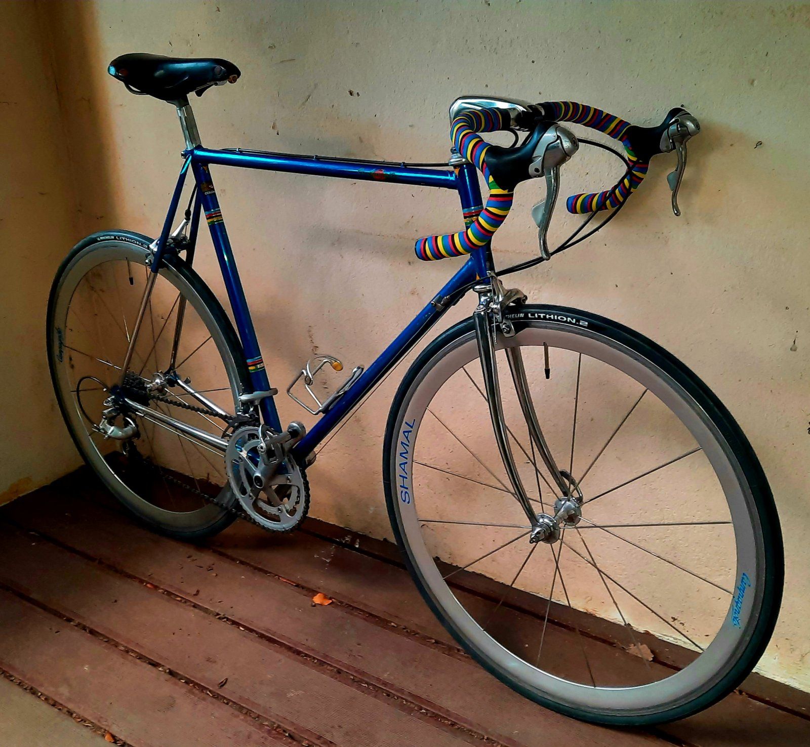 Zum LB: Ich hatte neulich mal nicht aufgepasst, da hat meine Papageien-Dame mein erst vor ein paar Wochen neu gewickeltes, schwarzes LB angfressen. Ich hatte sooo'n Hals - und kein schwarzes LB mehr im Haus. Das Cinelli mit den Weltmeisterstreifen lag schon ein paar Jahre hier rum, und da dachte ich, da an dem Rahmen keine Decals sind, außer eben auch die WM-Streifen: Wenn nicht jetzt, wann dann?!