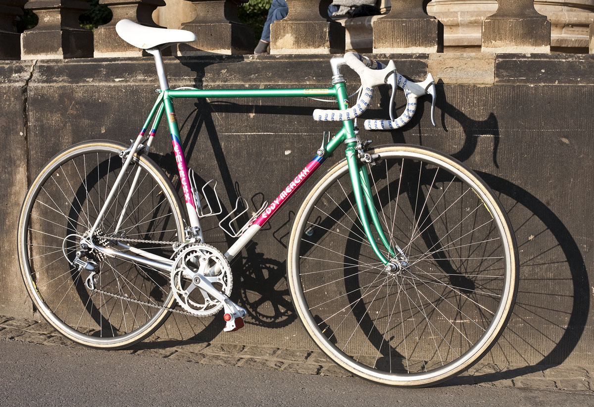 so, hier nun das rad in fast perfektem l'eroica zustand... breitere bereifung kommt die nächsten tage noch drauf, ansonsten bin ich nach zerlegen und zusammenbauen sehr zufrieden. für meine rossin-freunde... hab letztens unglaublicherweise mit dem sohn von mario rossin (jaja blabla, ohne scheiß