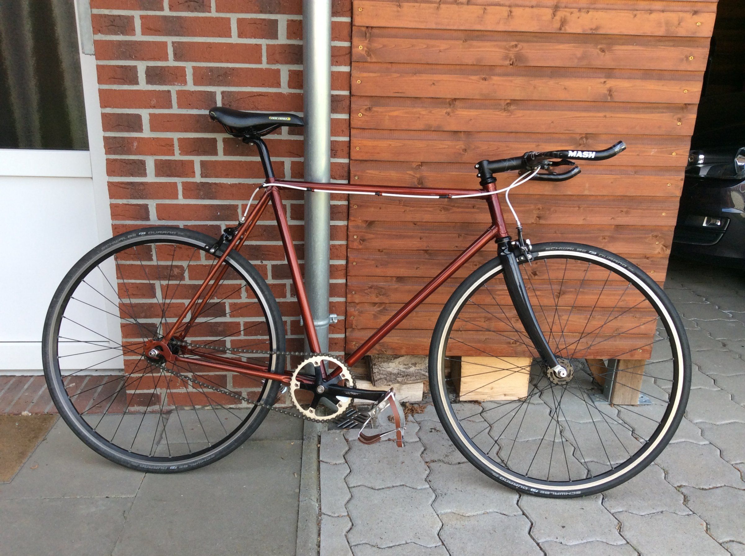Das Bild täuscht. Die Hüllen sind zwar etwas zu kurz, aber nicht massiv.Hintere Bremszughülle sieht massiv zu kurz aus. Die Farbe gefällt mir ganz gut, aber bei dem filigranen Rahmen ist die Lenker/Vorbau-Kombi arg klobig...