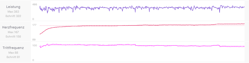 Kadenz knapp 30 höher, HF 20 Schläge mehr.. habe anschließend nochmal 10 Minuten gemacht, da ging der Puls bis 190. Ich bin übrigens 46. Das hat schon was von Kammerflimmern.