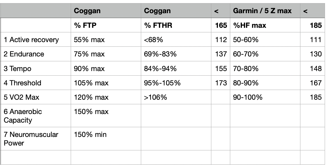 Mein Garmin Radcomputer nutzt von Haus aus komplett unterschiedliche Zonenmodelle für Herzfrequenz und Leistung. Deshalb ist die HF nicht in derselben Zone wie die Leistung. Die voreingestellten Coggan-Zonen in der Leistung kann man stattdessen einfach mit Coggan-Zonen in der HF kombinieren und dann ist es schon deutlich besser. Hier mal für 185 max HF und 165 Schwellen HF auch die Obergrenzen ausgerechnet.