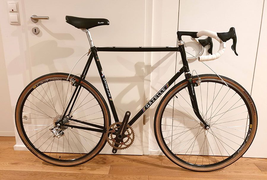 Es handelt sich um eine Cross Trophy von etwa 1982 in 62cm c/t. Das Lenkerband ist nur ein Farbtest mit Resten - bin mir noch nicht so sicher, ob weiss richtig ist. Meine Tendenz geht eher zu einem unempfindlichen Weinrot. Eine goldene Kette liegt schon bereit.