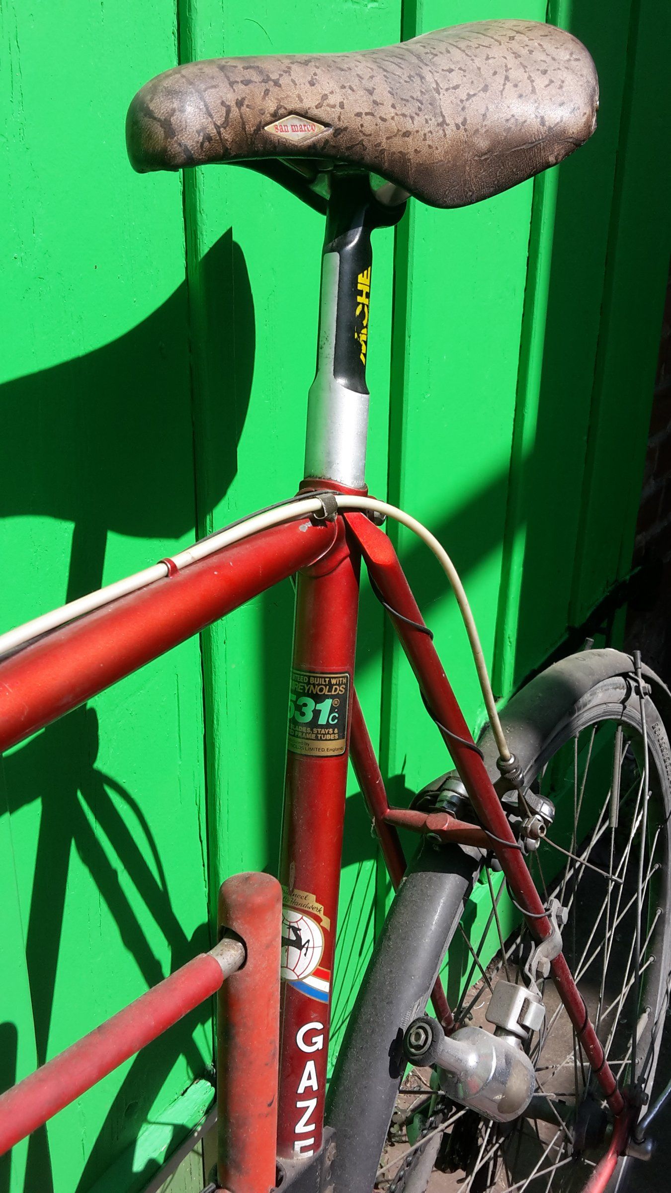 Es ist ein 62er, 531c - was bedeutet das ? Auf der linken Kettenstrebe - Moment ! so kann die doch gar nicht heißen ? - steht "A-FRAME".Wie man sieht: nicht 600, sondern 495 weniger. Alles solider Kram, dennoch wird fast alles verschwinden und auf 130 aufgebogen. Wie man solche Lenker fahren kann, war mir immer schon ein heiliges Rätsel, aber dem liegt offenbar so eine Art 3-Stufen-Theorie zugrunde. (Bei der Bremsgriffhaltung sehe ich mich automatisch über den Lenker gehen). Der Dynamo läuft irre leicht, Überraschung ! Aber wenn, dann Nady. Die Schutzbleche sind sehr gut montiert, vielleicht lasse ich die dran.